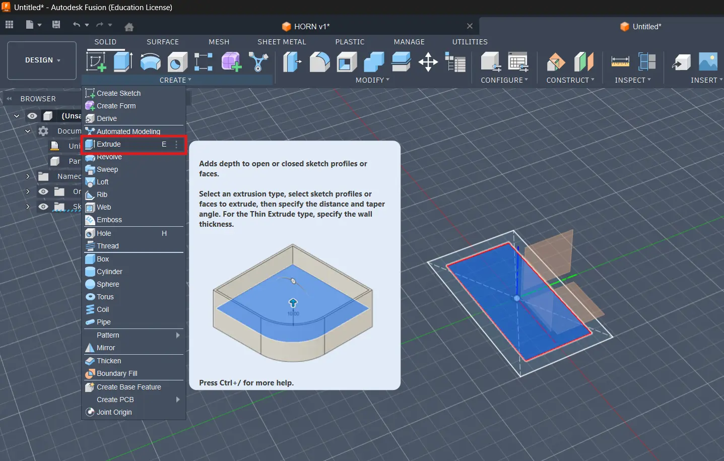 Then I created the horn shape using the spline tool and extruded it to create the 3D shape of the horn.