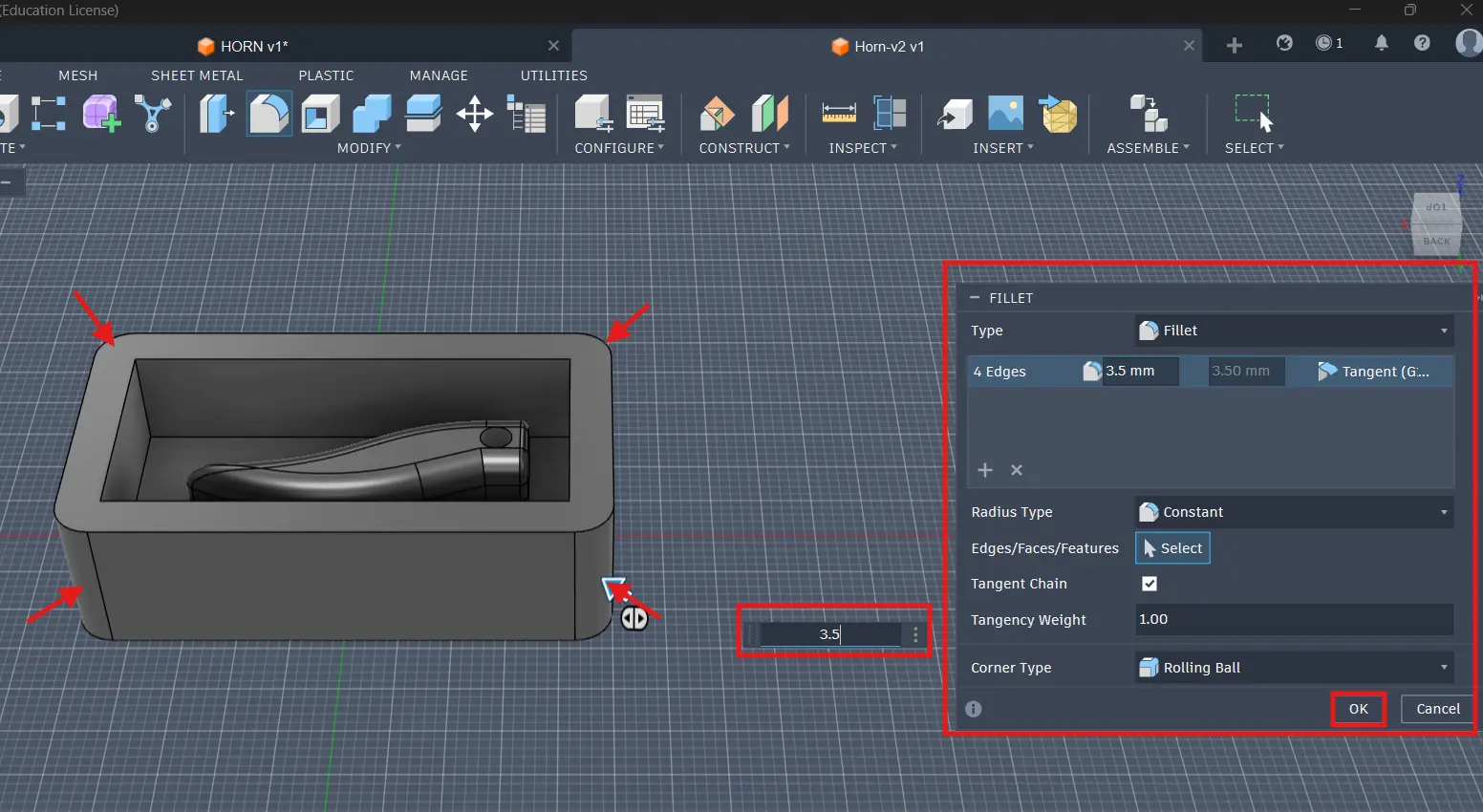 Then using the fillet tool I rounded the edges of the horn to make it look more realistic and also rounded the box edges to make everything look a lot smoother.