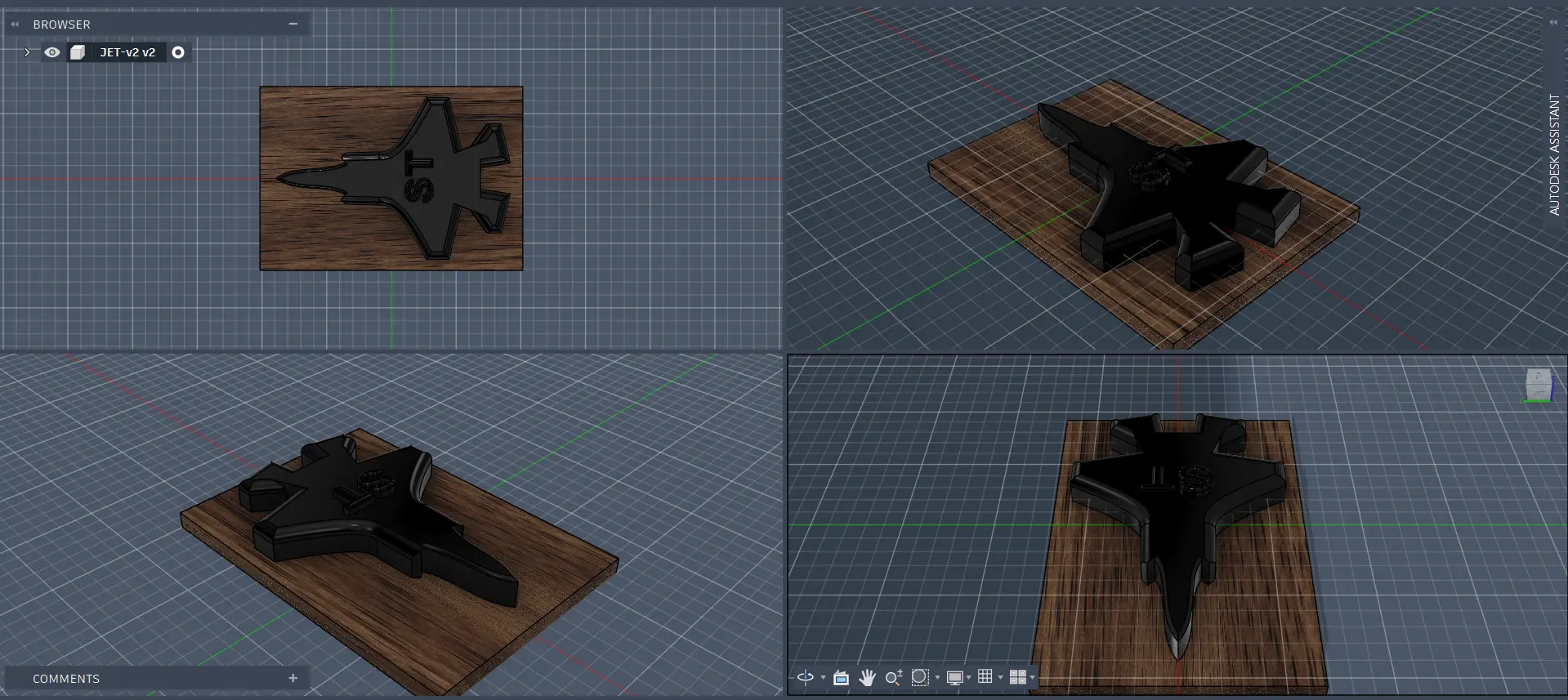 After that I extruded the jet shape to create the 3D shape and used the fillet tool to round the edges to make it look more realistic. I also added my initials on top of the jet using the text tool and extruded it to make it stand out. I really liked how it turned out! 😄