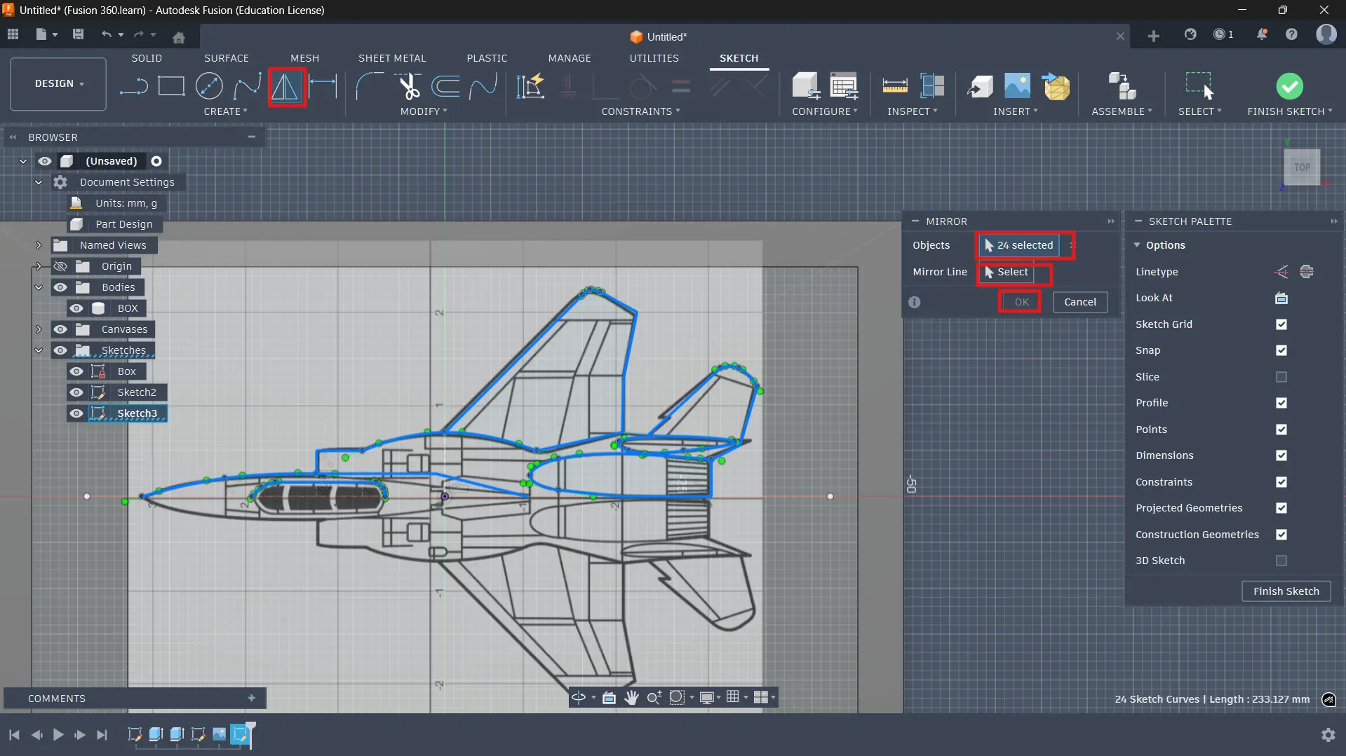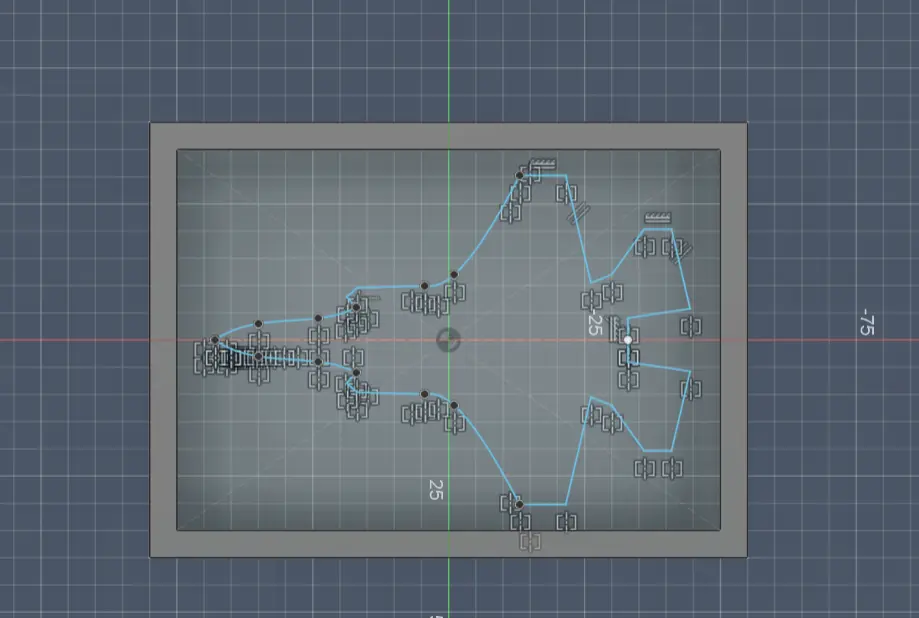Then I created a sketch on the top face of the base and using the insert tool I imported an image of a F15 fighter jet and drew the outline of the jet using the line and arc tools.