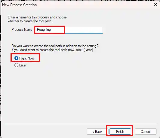 - First you have to make the toolpath for the roughing pass which is the first pass that will remove the majority of the material. For this I used the 3.175mm square end mill. Click New Process then Roughing then Next.