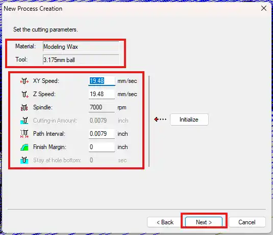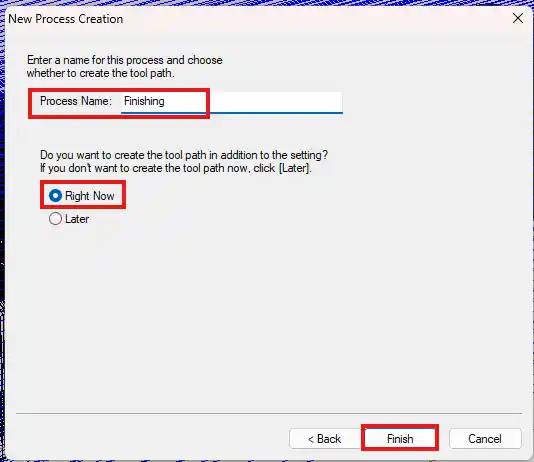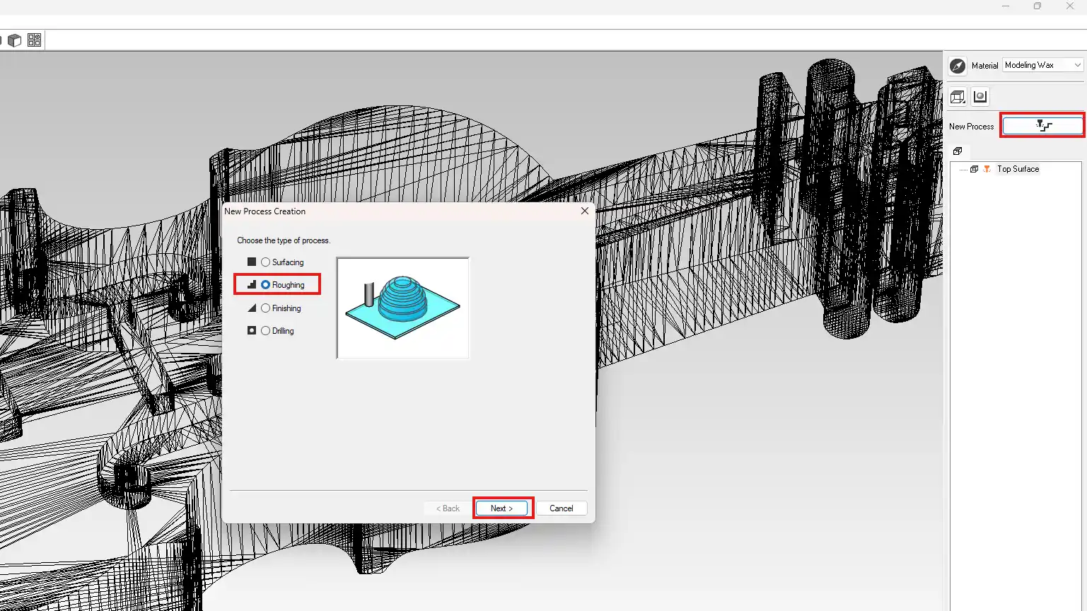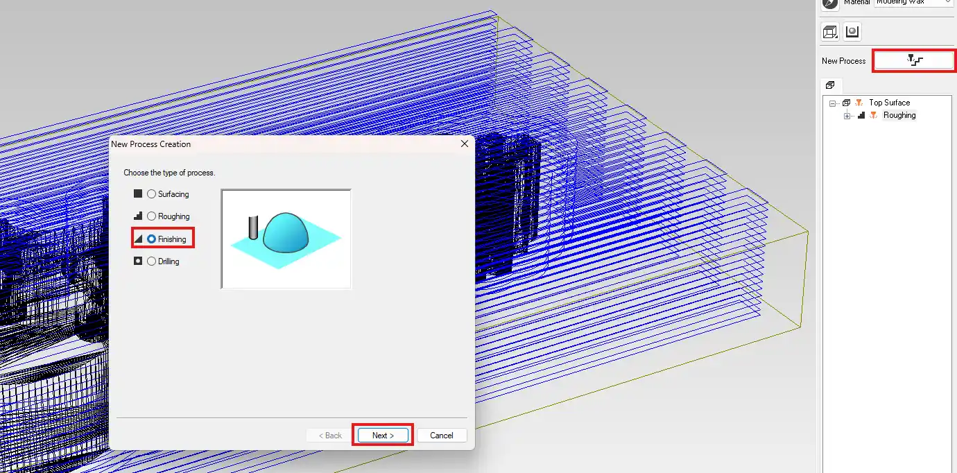 - Now you have to make the toolpath for the finishing pass which is the second pass that will give the mold a smooth surface finish. For this I used the 3.175mm ball end mill. Click New Process then Finishing then Next.
