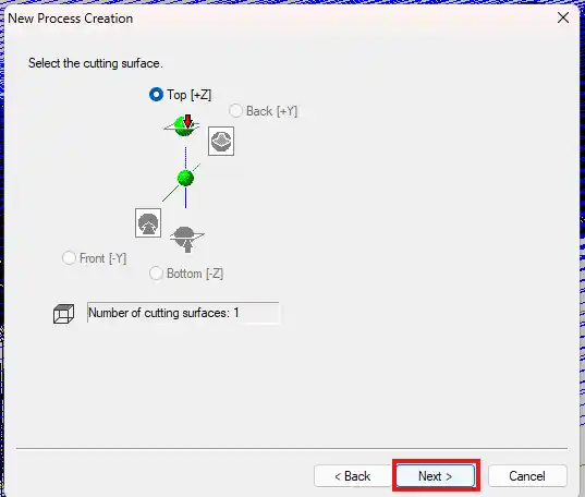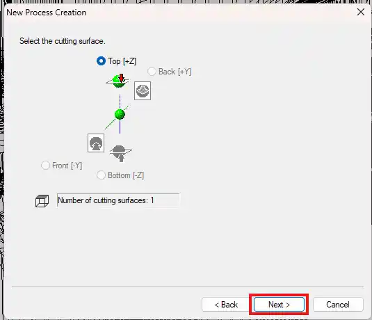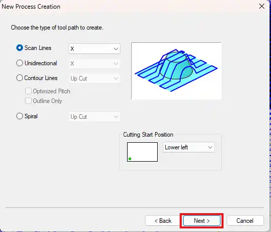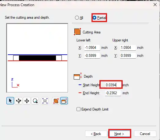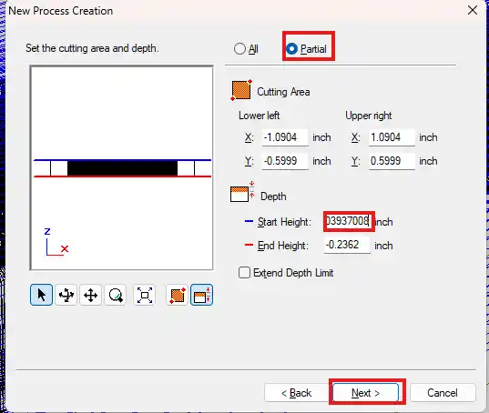 - Click Partial and set the start height to 5-10mm above the highest point of the model to make sure the tool does not crash into the model at the start of the milling process. Then click Next.