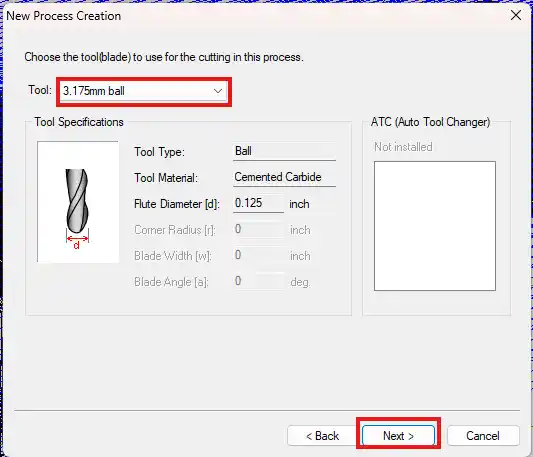 - Select the 3.175mm ball end mill from the list of tools and click Next.