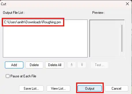 To add the finishing pass file click Add again, select the finishing pass file, click Open and then click Output to Machine to start the finishing pass.