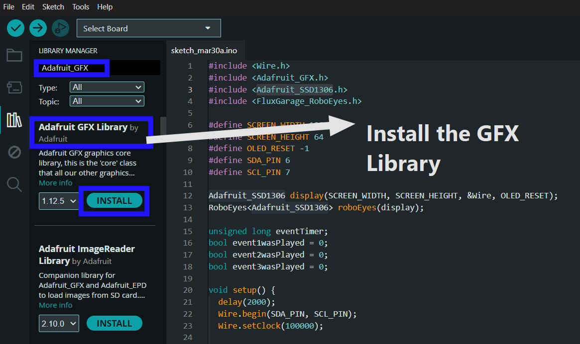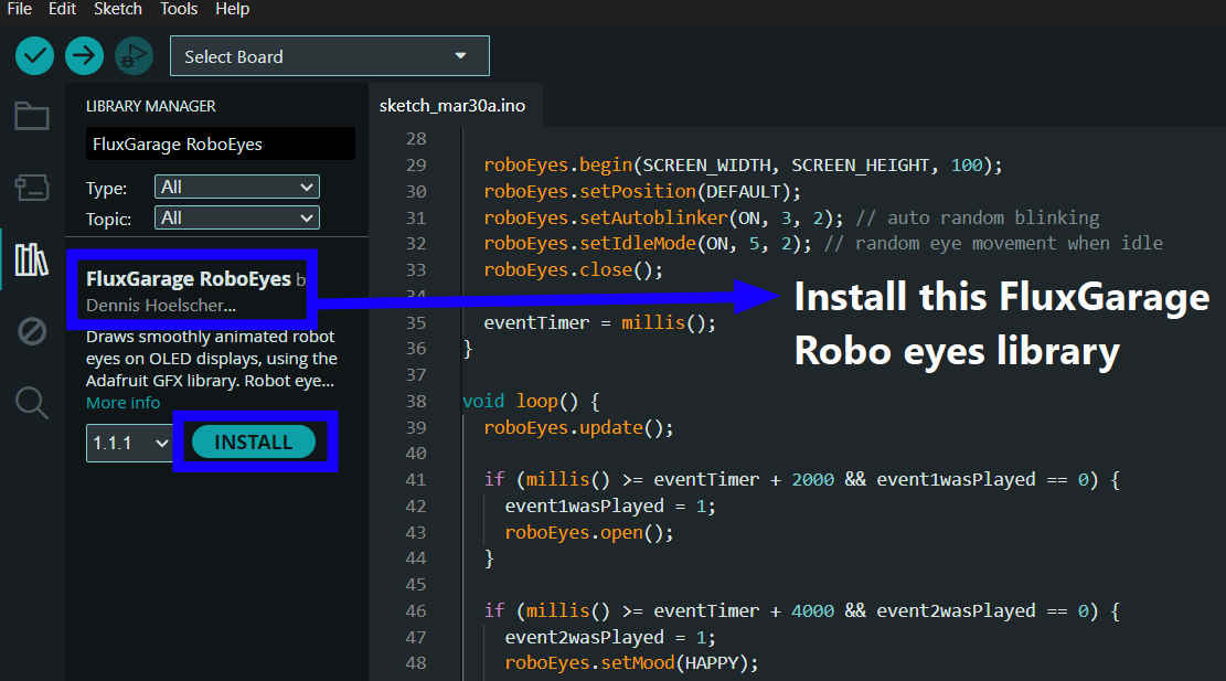 I followed this documentation and found out that to create the popular big robo eyes, I needed to download the FluxGarage RoboEyes Library.