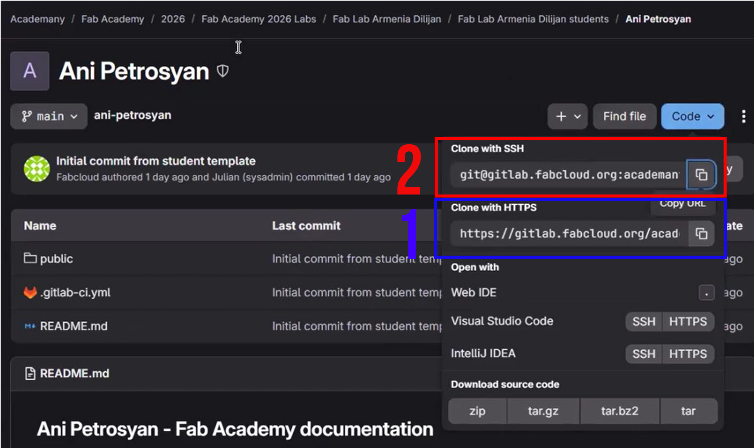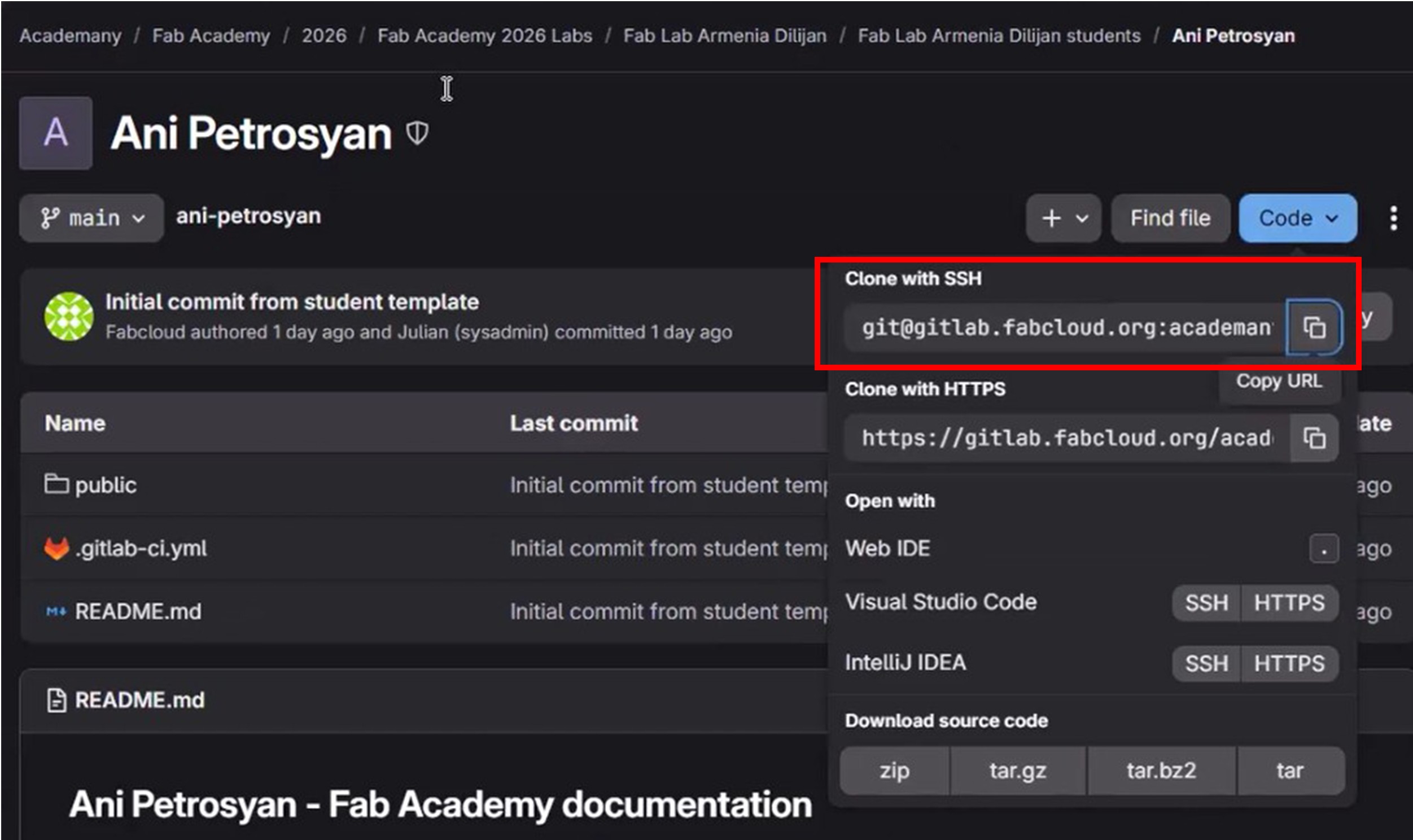 I went to the Fab Academy repository on GitHub/GitLab, clicked Code, selected SSH, and copied the displayed URL.