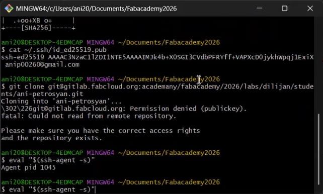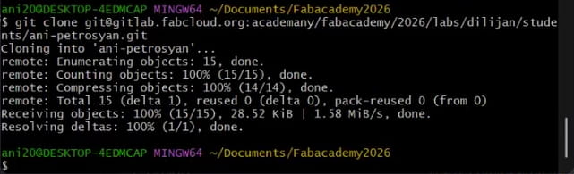 Once my SSH key was added and the connection was established, I cloned the Fab Academy repository to my local computer. Cloning creates a complete copy of all files, folders, and the entire history of the remote repository, allowing me to work locally while keeping it in sync with the remote version.