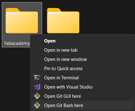 So we got the programs Git and Visual Studio, now let’s run Git Bash somewhere in a Fablab” folder (prepared in advance) by right click > * show more options (for Windows 11) > Open Git Bash here.
