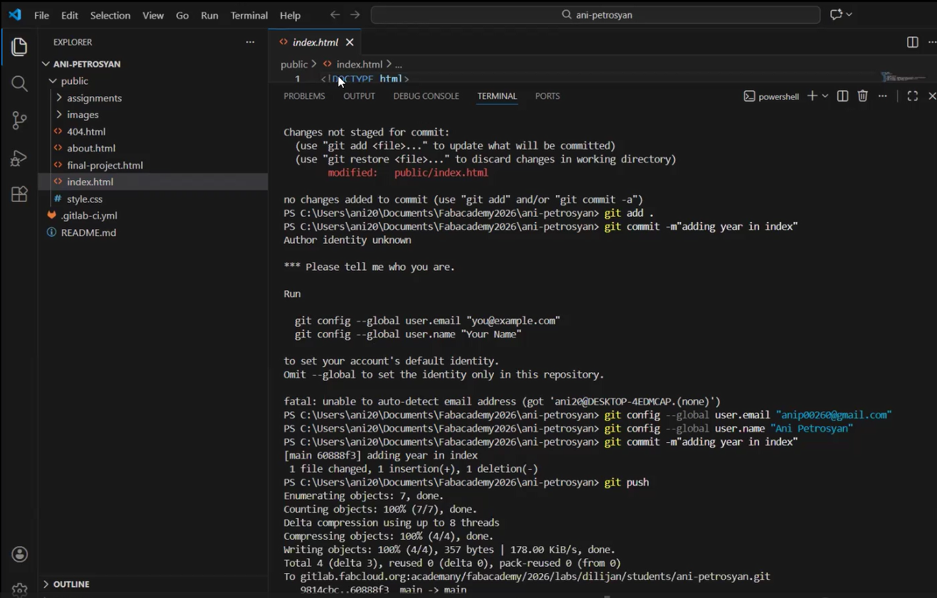 Since I had no prior experience in website development, I began by exploring the documentation pages of Fab Academy participants from previous years. In particular, I studied the documentation of last year’s participant Mkhitar Evoyan, the previous year’s participant Elen Grigoryan, and Rudolf Igityan, a participant from 2023.
