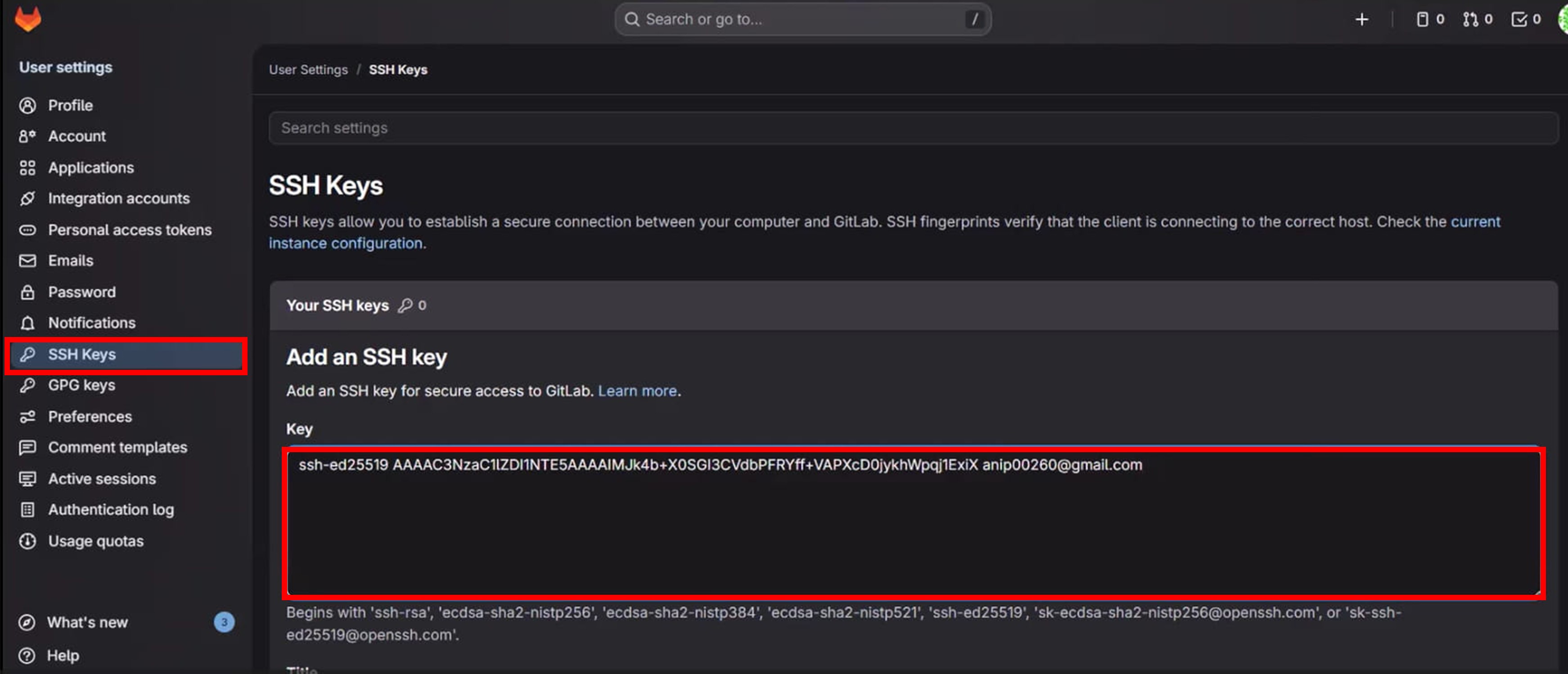 In order to establish a secure connection with GitLab, I generated an SSH key using the following command.