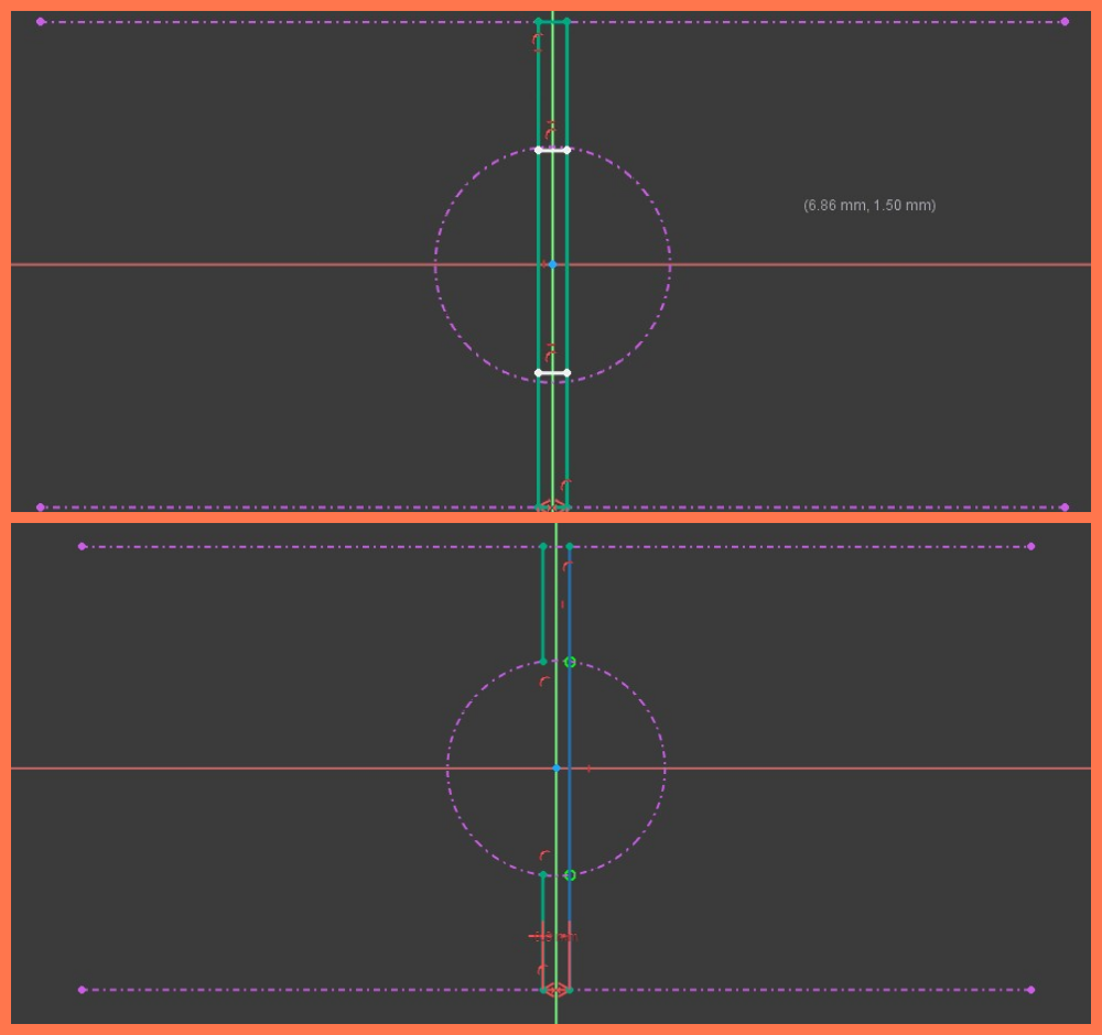 I added vertical and coincident constraints to properly position the sketch elements relative to the reference axes, then used the Trim tool to remove unnecessary segments.