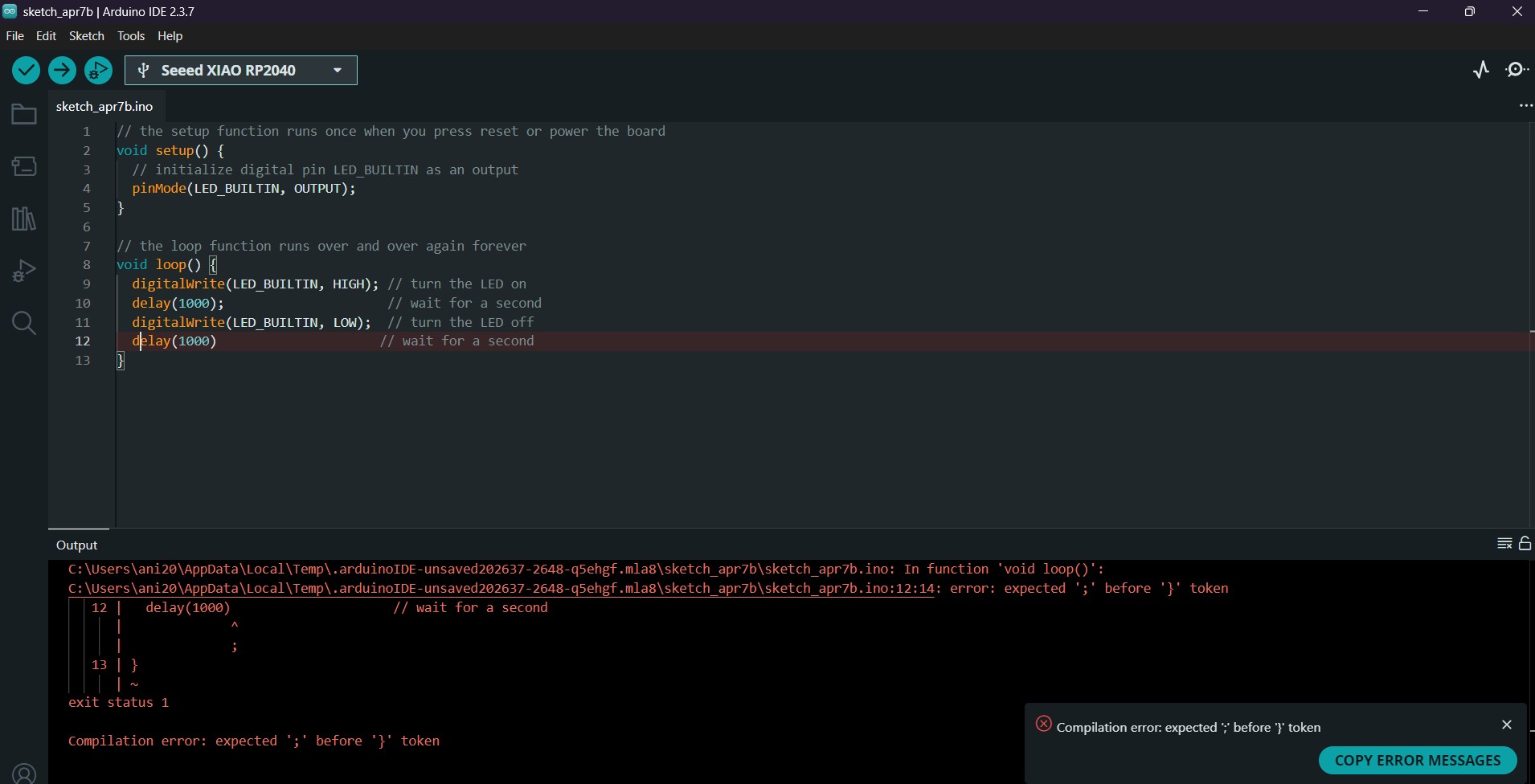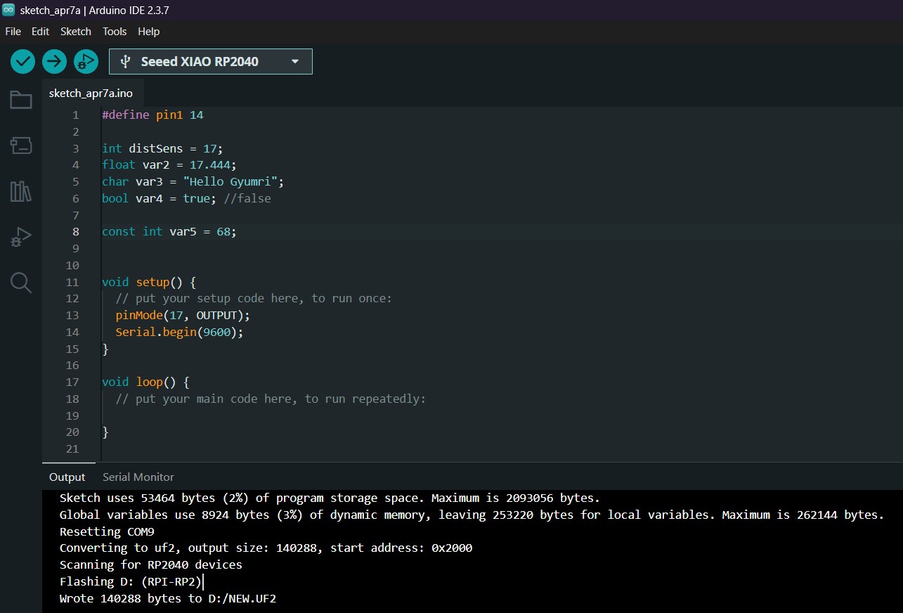 This week, I learned the fundamentals of embedded programming by working with the Seeed Studio XIAO RP2040 microcontroller. I gained experience in writing, verifying, and uploading programs using the Arduino IDE, and I worked with digital outputs by controlling LEDs and creating simple lighting effects.