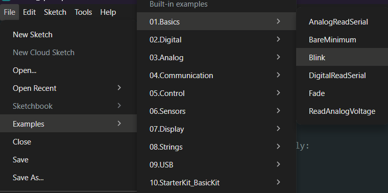 The Arduino IDE provides built-in examples that help you understand how the RP2040 board works. One of the simplest examples is the Blink program.
