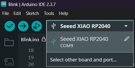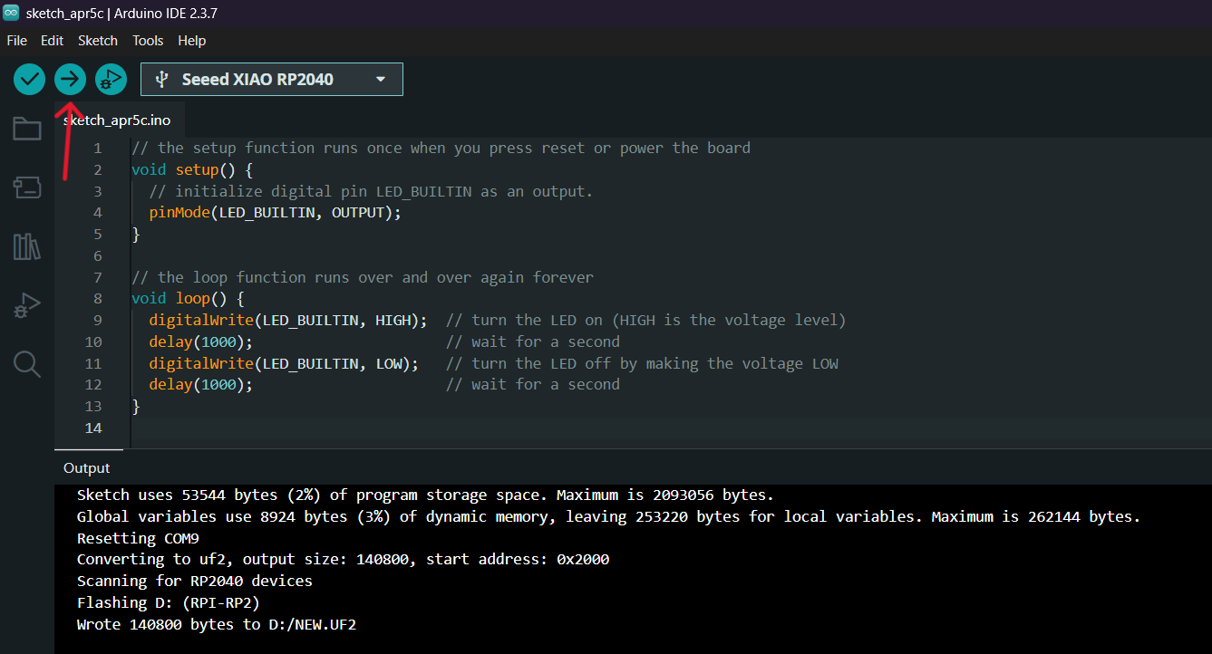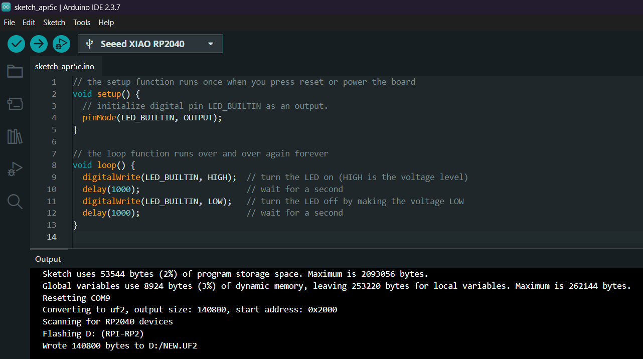 Once the program is successfully uploaded, the built-in LED on the RP2040 will start blinking: