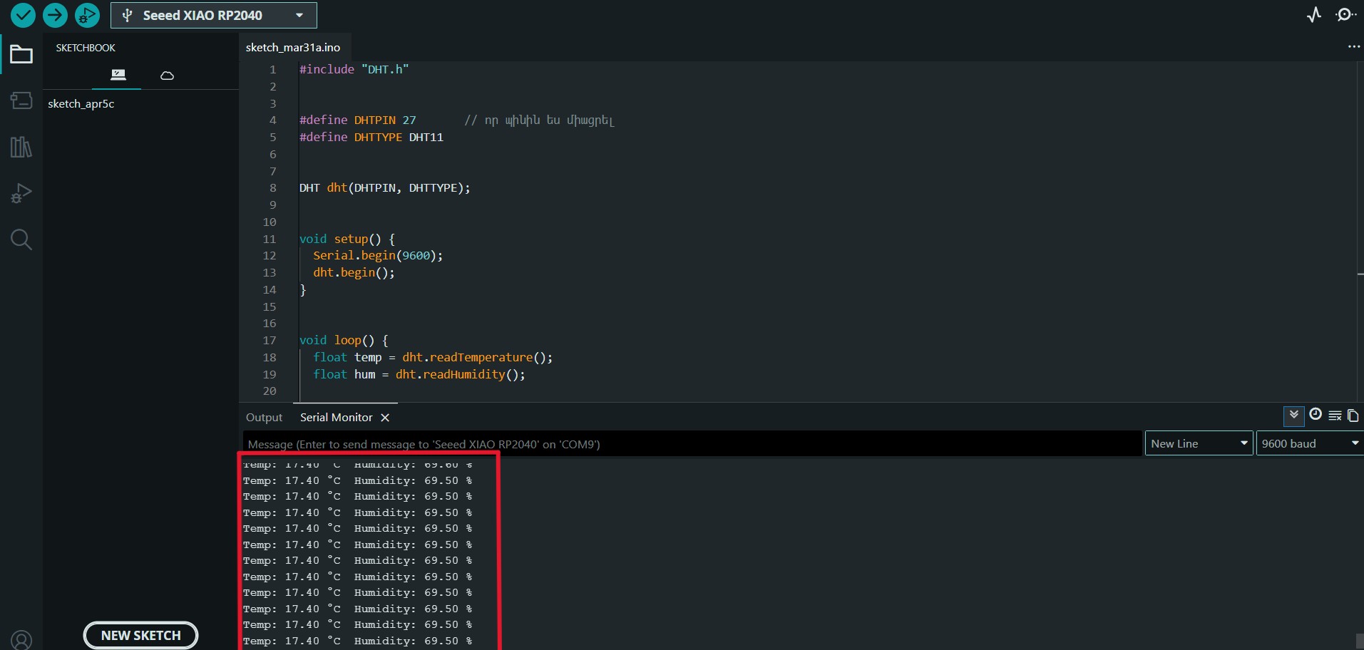 The obtained data can be displayed on the serial monitor or used in other projects. As a result of this experiment, it was confirmed that the DHT11 sensor can effectively work with the Seeed Studio XIAO RP2040 microcontroller and provide the required measurements.