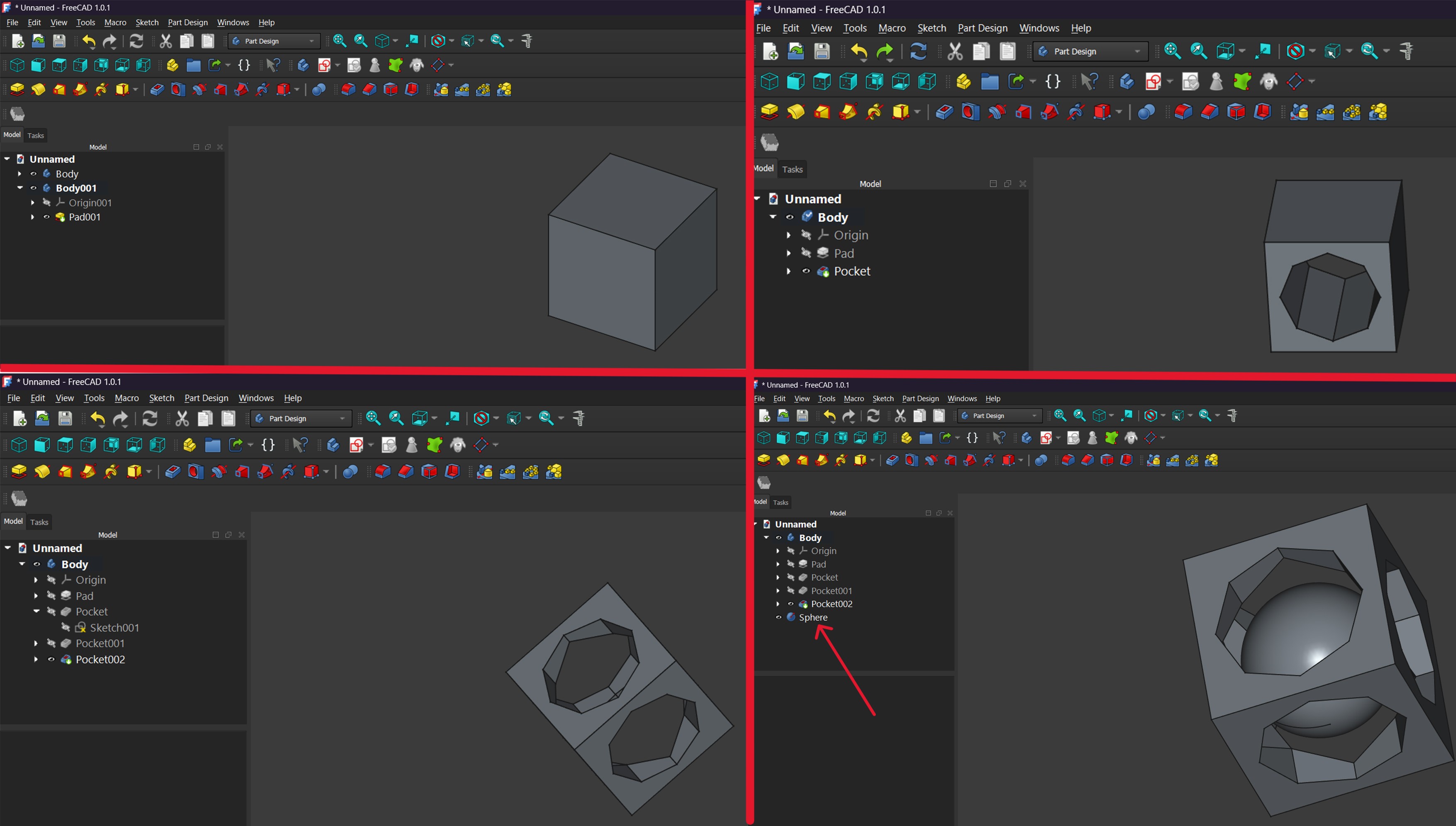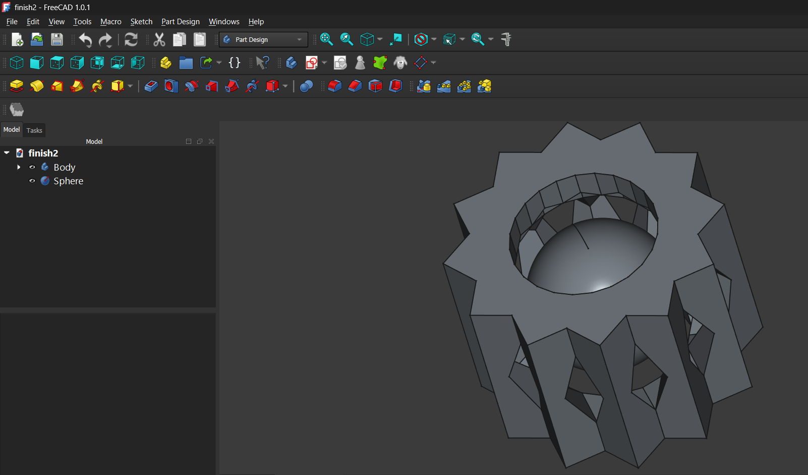 As part of the assignment, I designed several small-scale 3D models that include enclosed internal geometric elements and cannot be produced through subtractive manufacturing. The modeling process was carried out in FreeCAD, using basic solid and geometric tools. During the design process, I created several variations, starting from simple primitive shapes and gradually modifying their structure, openings, and outer geometry. This iterative approach resulted in multiple design versions with different structural solutions, each incorporating an internal sphere element.