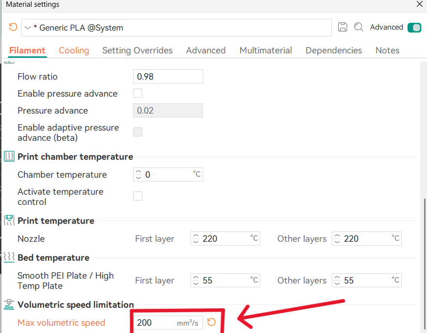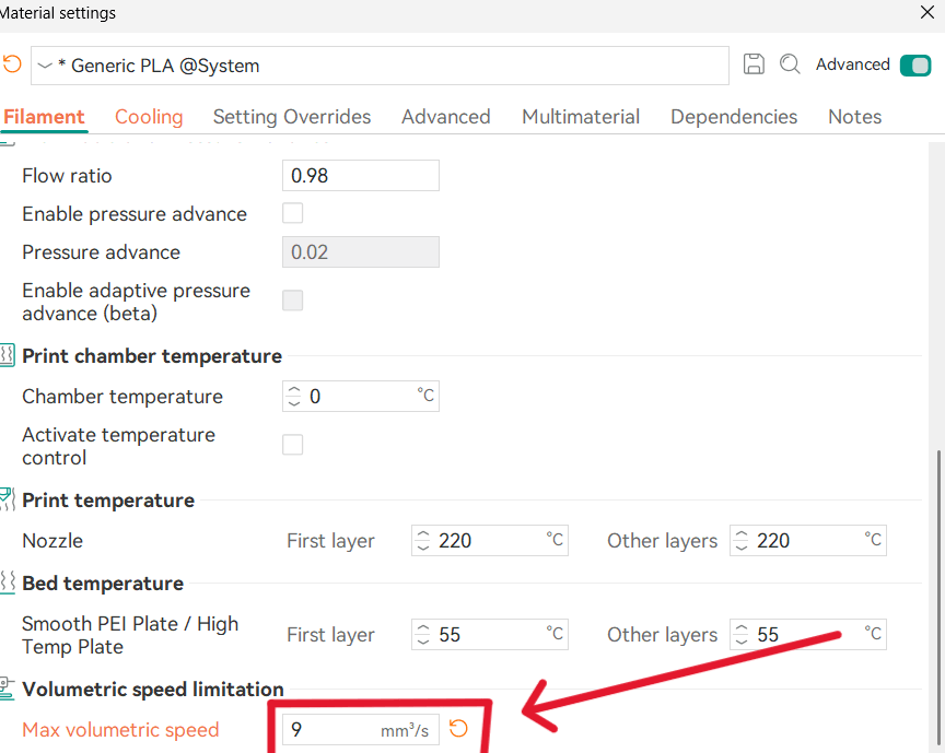 Although the software suggested a default value of 200, our calculations showed that the correct maximum flow rate is 9 mm³/s. Therefore, the slicer setting was adjusted to 9, as this proved to be the optimal value for this specific material.