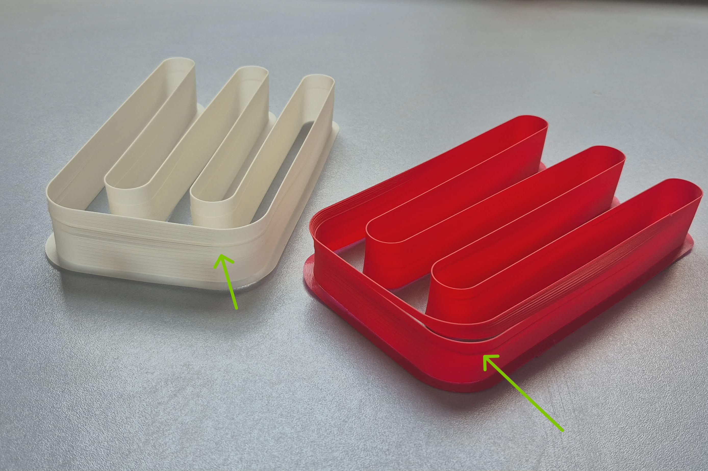 At lower flow rates, extrusion was stable, walls were solid, and surface quality was clean for both filaments. However, after the 8th line, differences became noticeable: