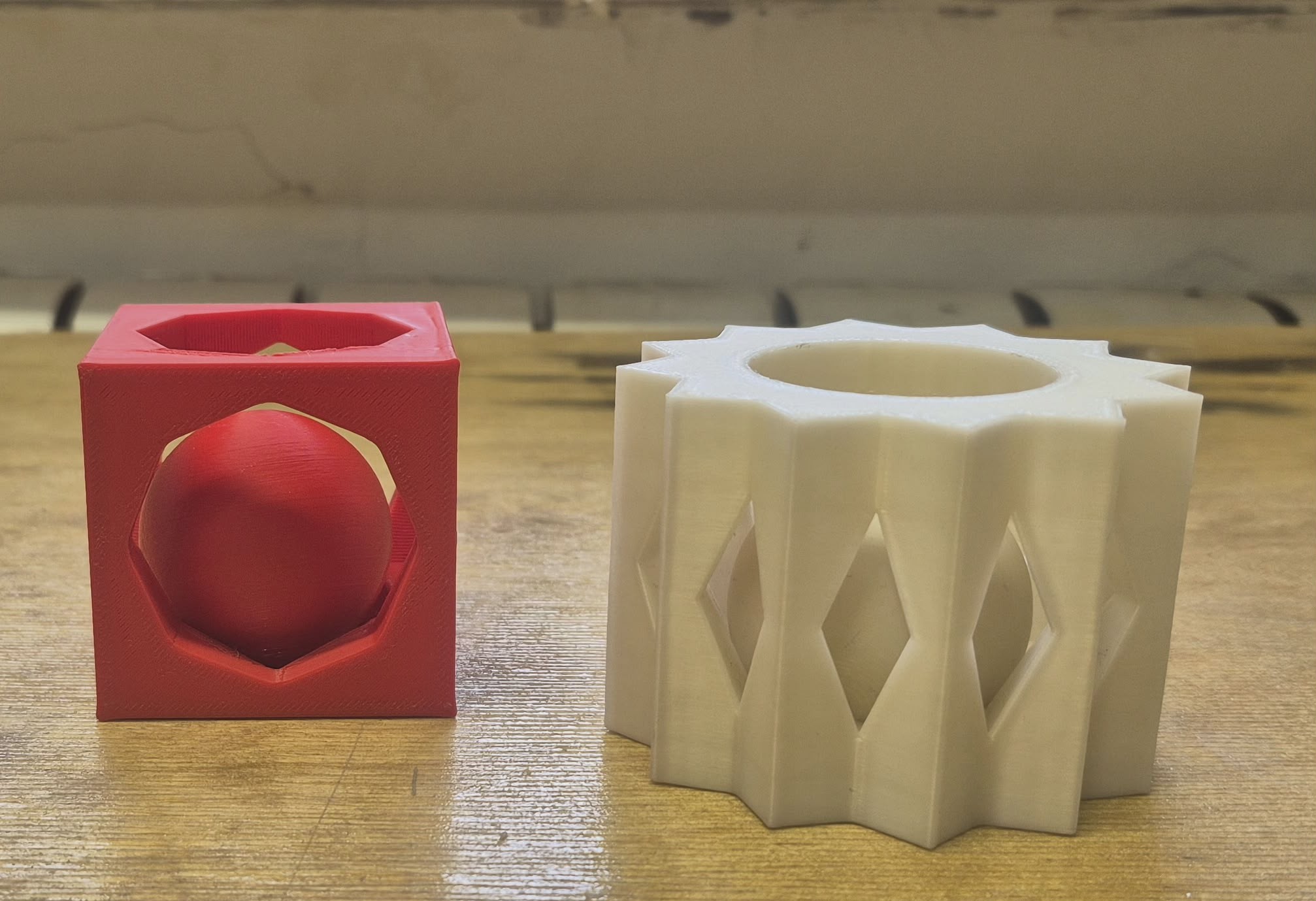 The second model consists of a cylindrical lattice structure formed by star-shaped outer walls, also containing an internal sphere. The outer shell is composed of repeating symmetrical elements that create a closed enclosure while still allowing visibility of the inner object. This design belongs to the category of print-in-place models, since the internal and external parts are printed simultaneously without requiring assembly afterward.
