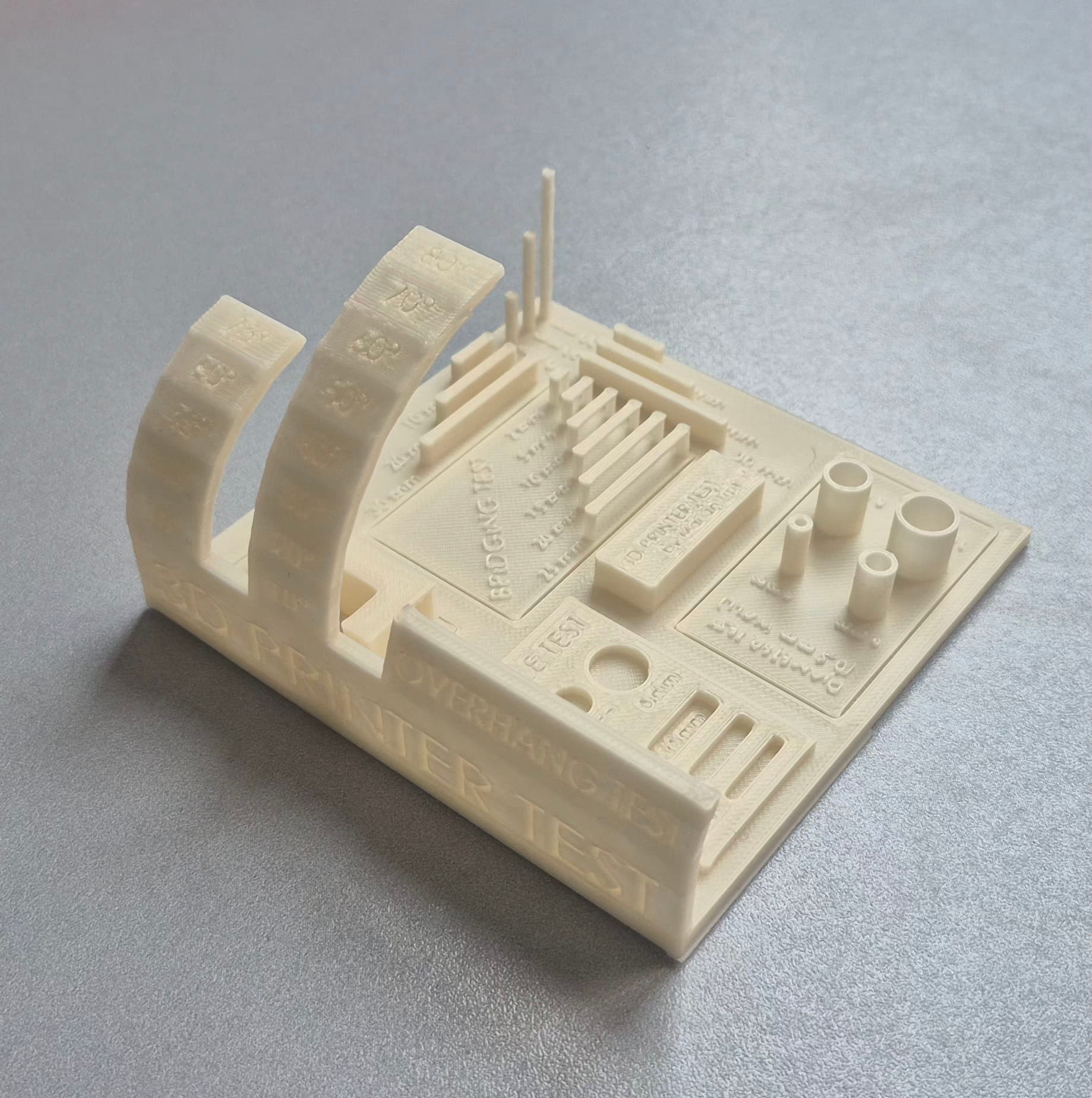 In the overhang test: - The first stepped section printed well up to 45°. The second stepped section printed well up to 60° without noticeable sagging or defects. This indicates better overhang performance in the second stepped section.