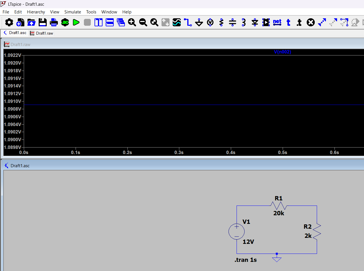 From the simulation graph, a current of about 1.25mA was observed, which fully matches the theoretical calculation. Since the resistors are equal, the voltage is divided equally, meaning each resistor has about 2.5V across it. This confirms the operating principle of the voltage divider and shows that the simulation results match the theoretical model.