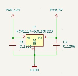 which converts the 12V input into a stable 5V output. Capacitors were added at the input and output of the regulator to stabilize the voltage and reduce electrical noise.