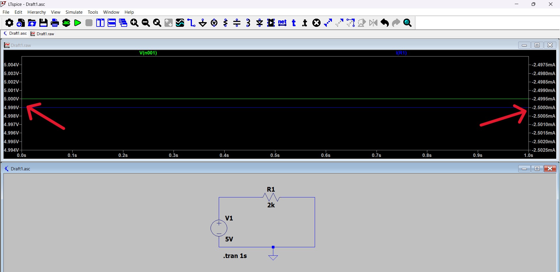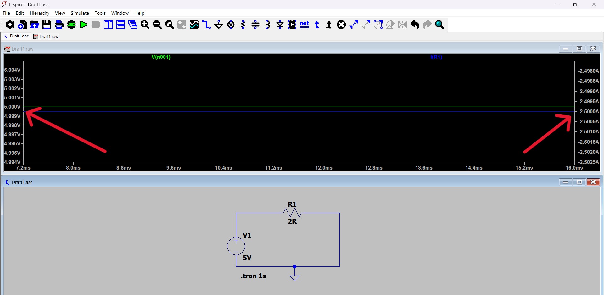 The circuit was recreated in LTspice to verify its operation through simulation and to confirm the theoretical calculations. A DC voltage source set to 5V was placed, and a 2Ω resistor was connected in series in the circuit. The negative terminal of the source was connected to ground to define the reference node. To run the simulation, a transient analysis command was added with a duration of 1 second. As a result, the current flowing through the circuit was observed to be about 2.5A, which fully matches the theoretical value calculated using Ohm’s law: I = V / R = 5 / 2 = 2.5A.