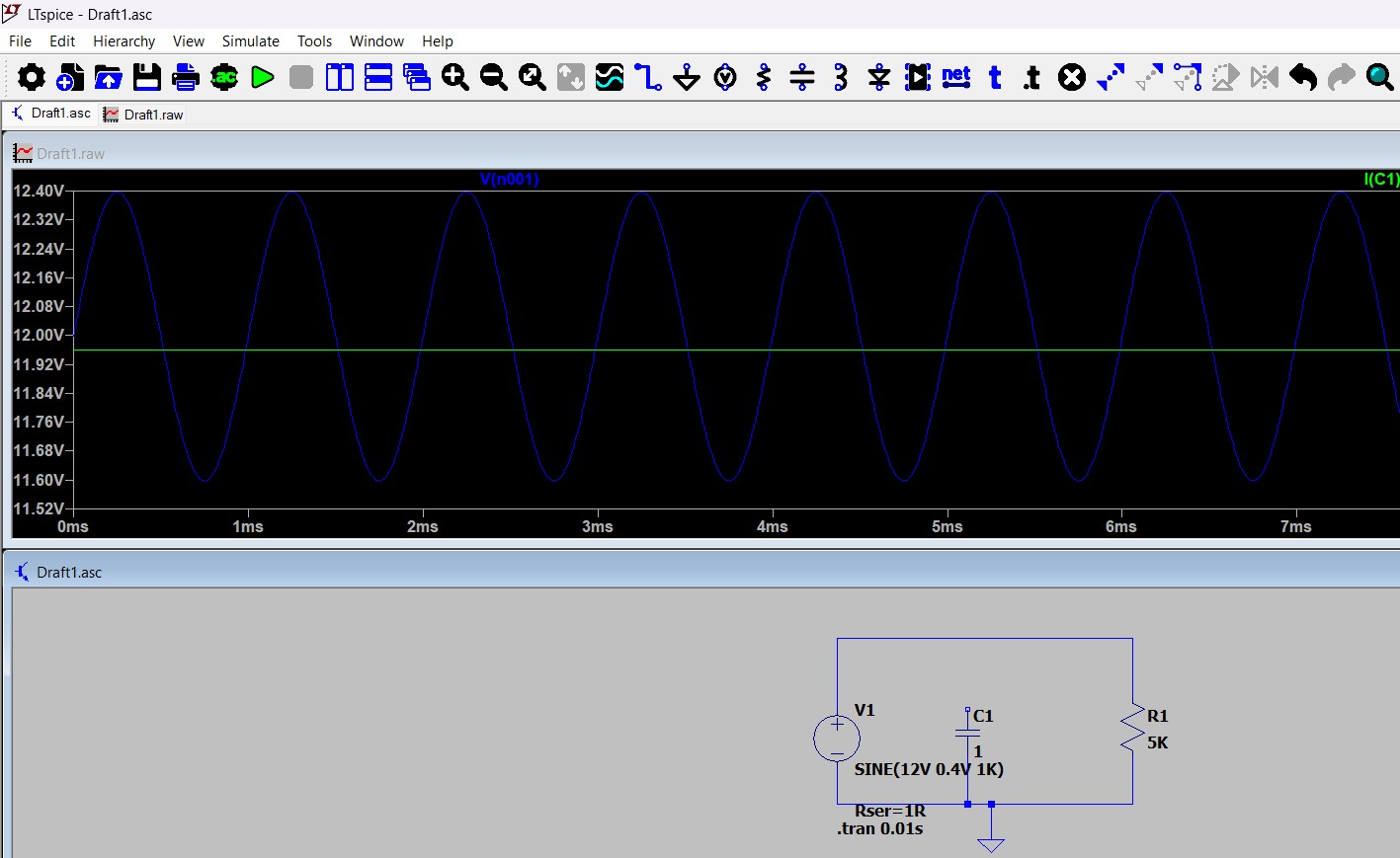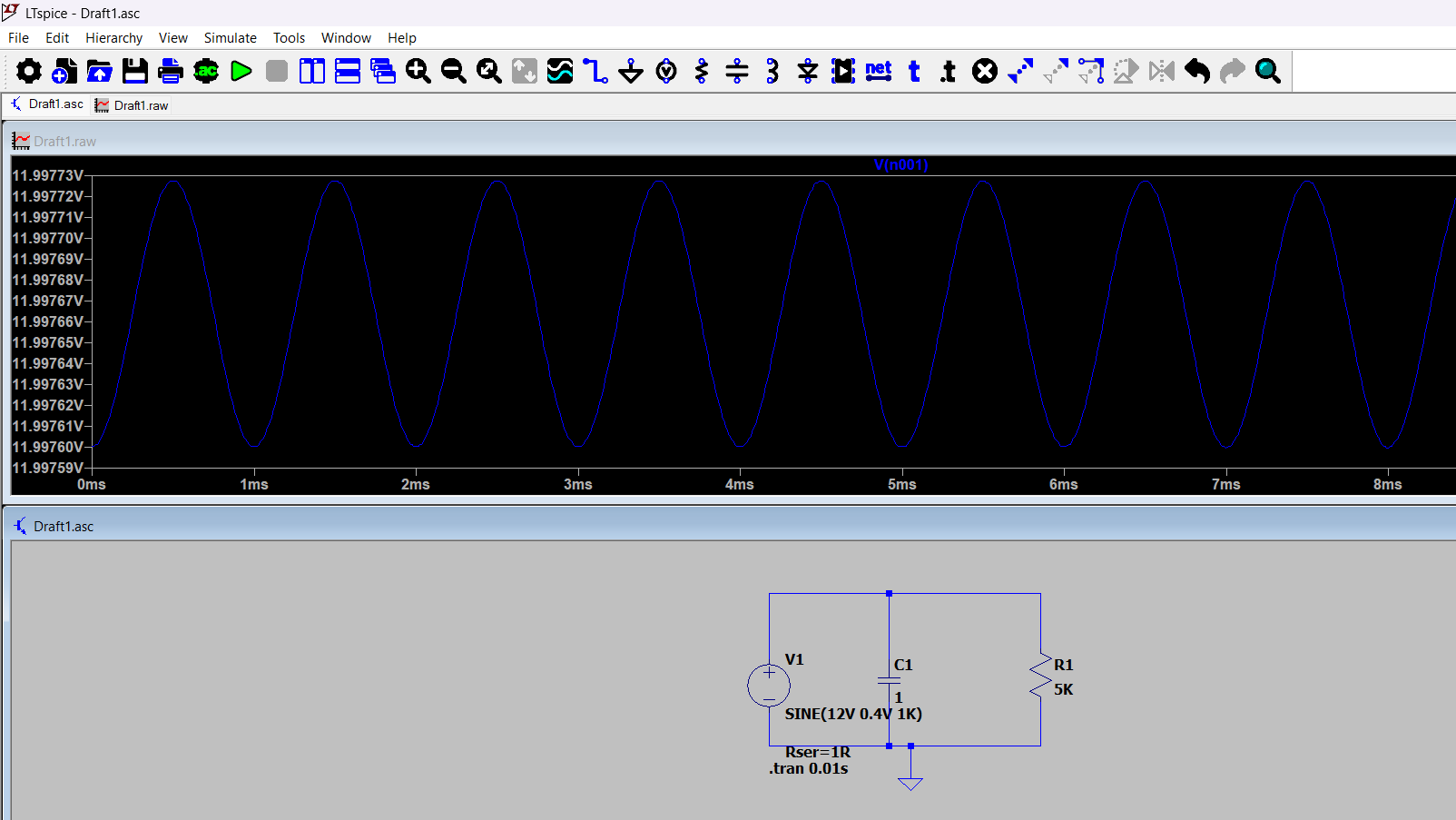 In the first simulation the circuit includes a 12V power source with a small AC component and a 5kΩ resistor load. Because the source contains a small AC signal, the output voltage is not perfectly stable.
