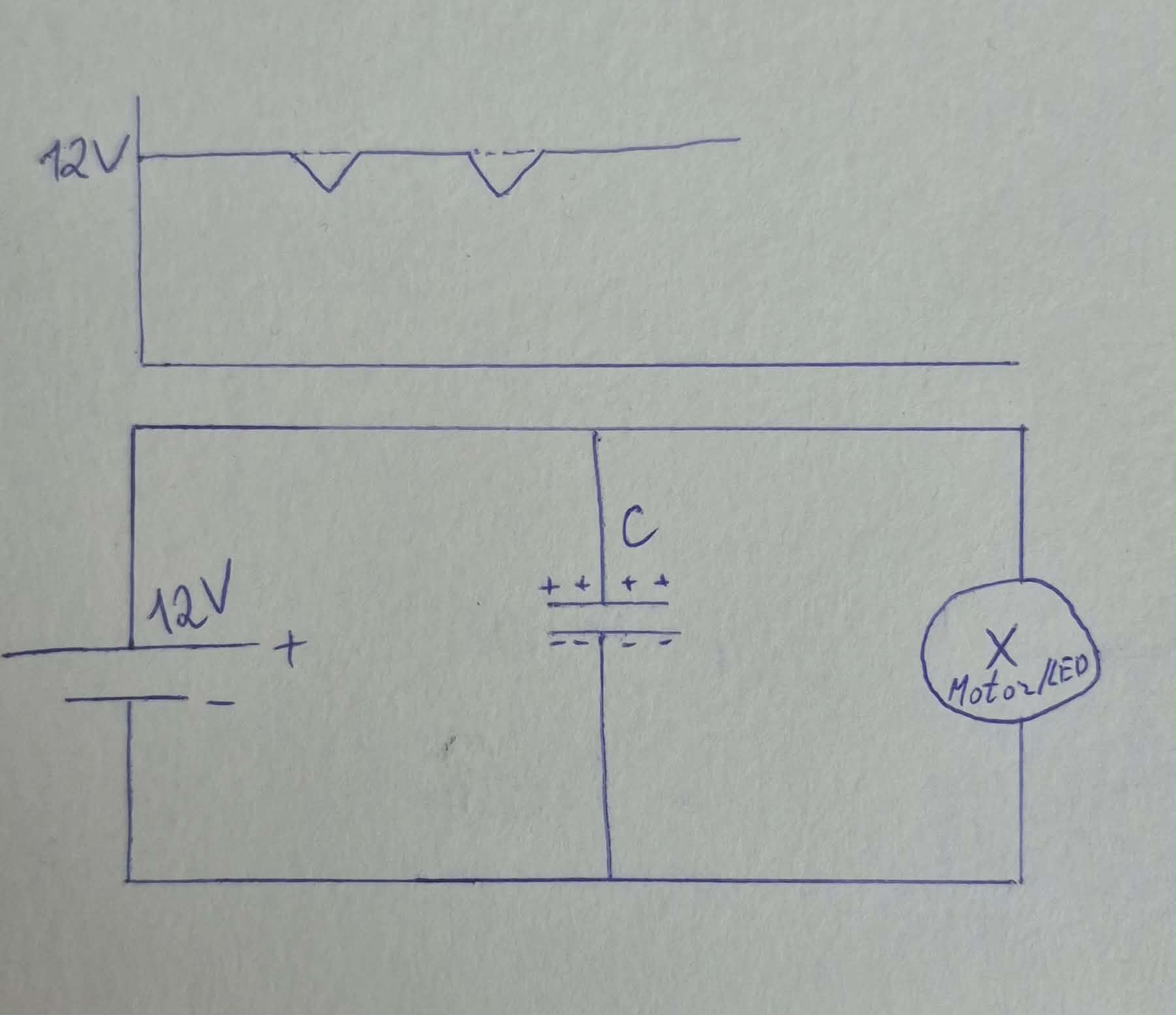 The diagram below shows a simple electronic circuit that includes a capacitor. On the left side of the circuit there is a 12V battery, which acts as the power supply. To the right of the battery a capacitor is connected, and further to the right there can be a load, for example a motor or a small lamp/LED.