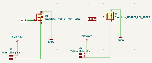 Since the microcontroller pins cannot directly drive high-voltage loads, the LED strips are controlled using MOSFET transistors. The MOSFETs act as electronic switches: the microcontroller sends a small control signal to the gate, which then allows the transistor to switch the 12V LED strip on or off safely.
