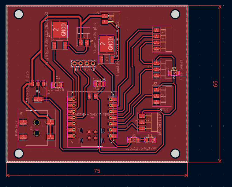 The final PCB design includes connectors for the microcontroller, sensors, LCD display, LED strips, and the power input. After completing this stage, the board is ready for manufacturing and further assembly.