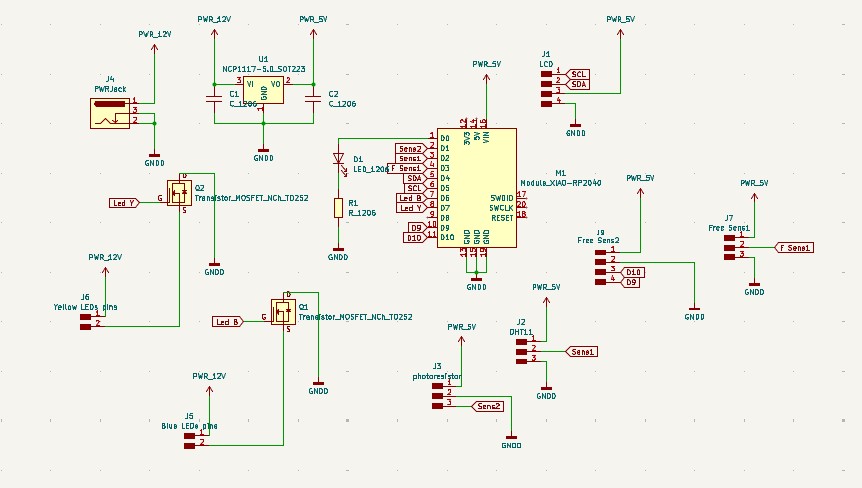 At this stage, I decided to focus on designing the electronics for my Final Project. The goal of the project is to create a system that can monitor environmental conditions, control lighting, and display information on a screen. For this purpose, I needed several key components: a light sensor, a temperature and humidity sensor, an LCD display, and 12V LED strip lights.