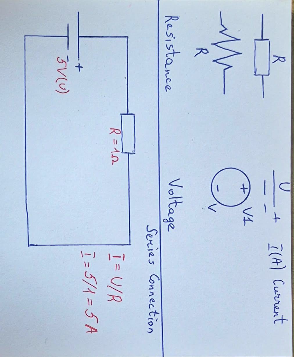 The given electrical circuit consists of a 5V voltage source and a single resistor R = 1Ω connected in a closed loop. In the circuit, current flows from the positive terminal of the source through the resistor and returns to the negative terminal. This configuration represents the simplest single-resistor electrical circuit and is used as a classical example to demonstrate the application of Ohm’s Law.