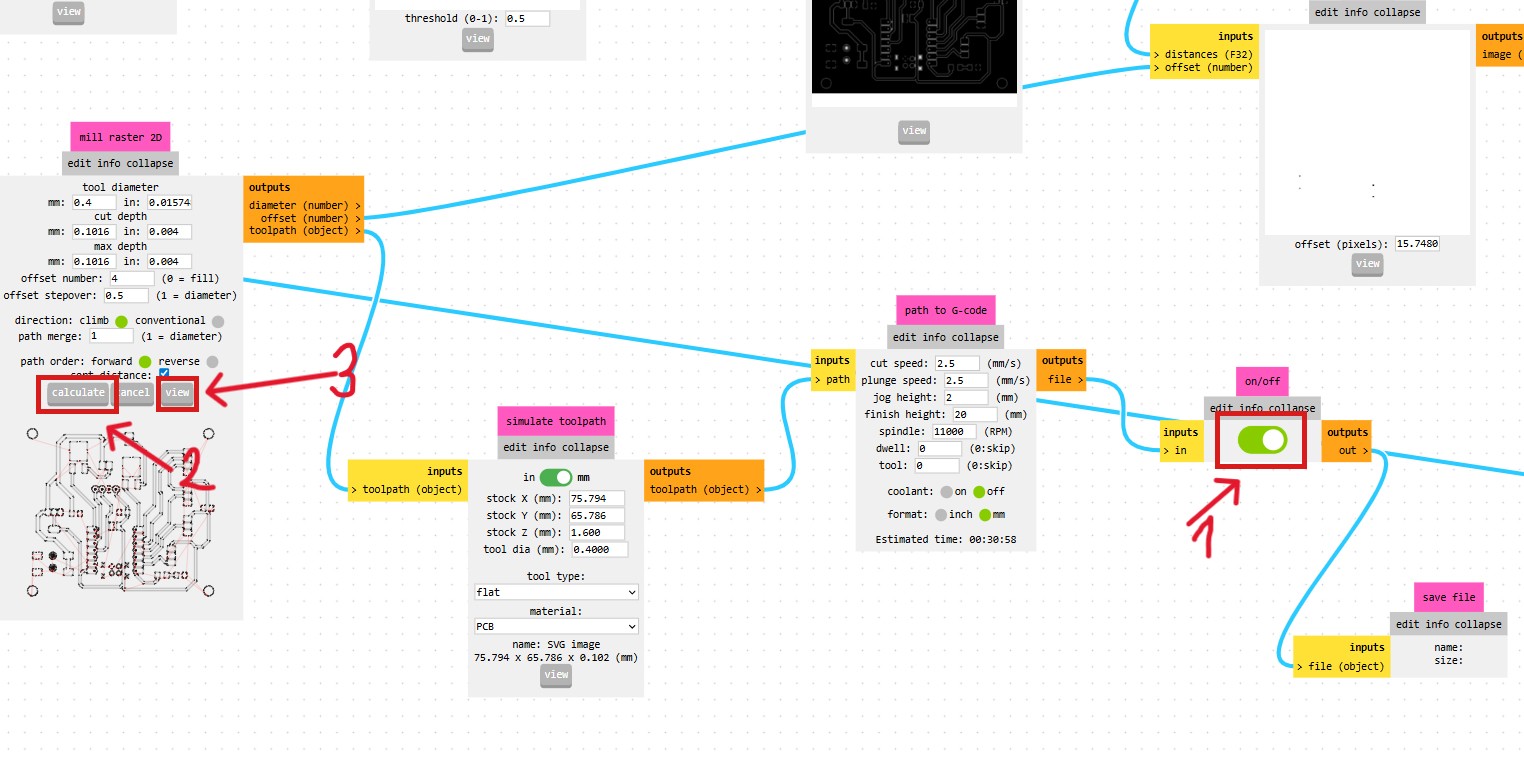 Then, I clicked the calculate button (2), and the program generated the toolpath and automatically forwarded it to the next modules.