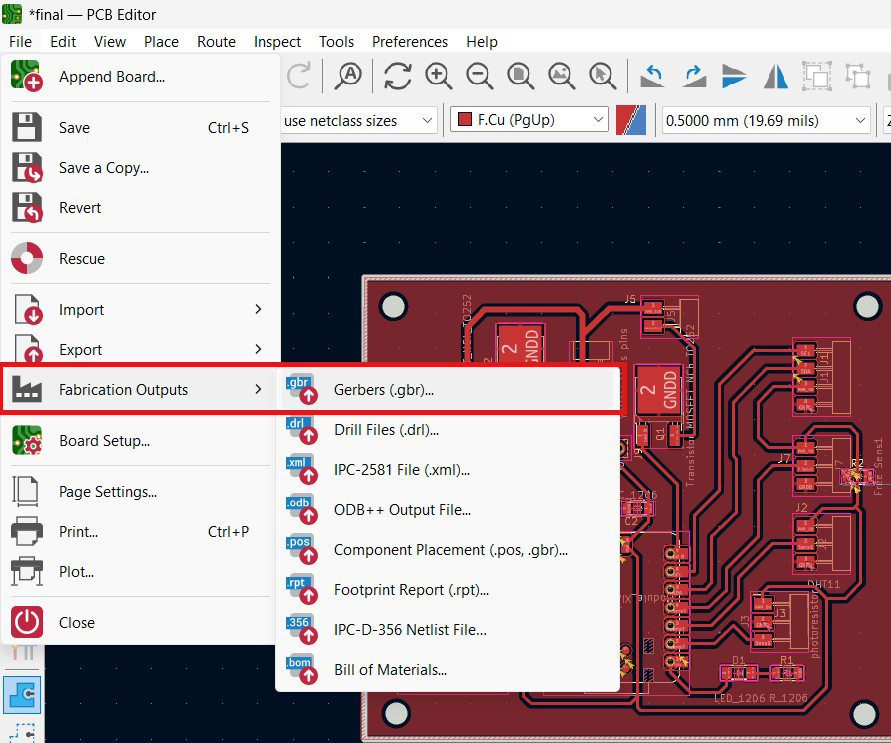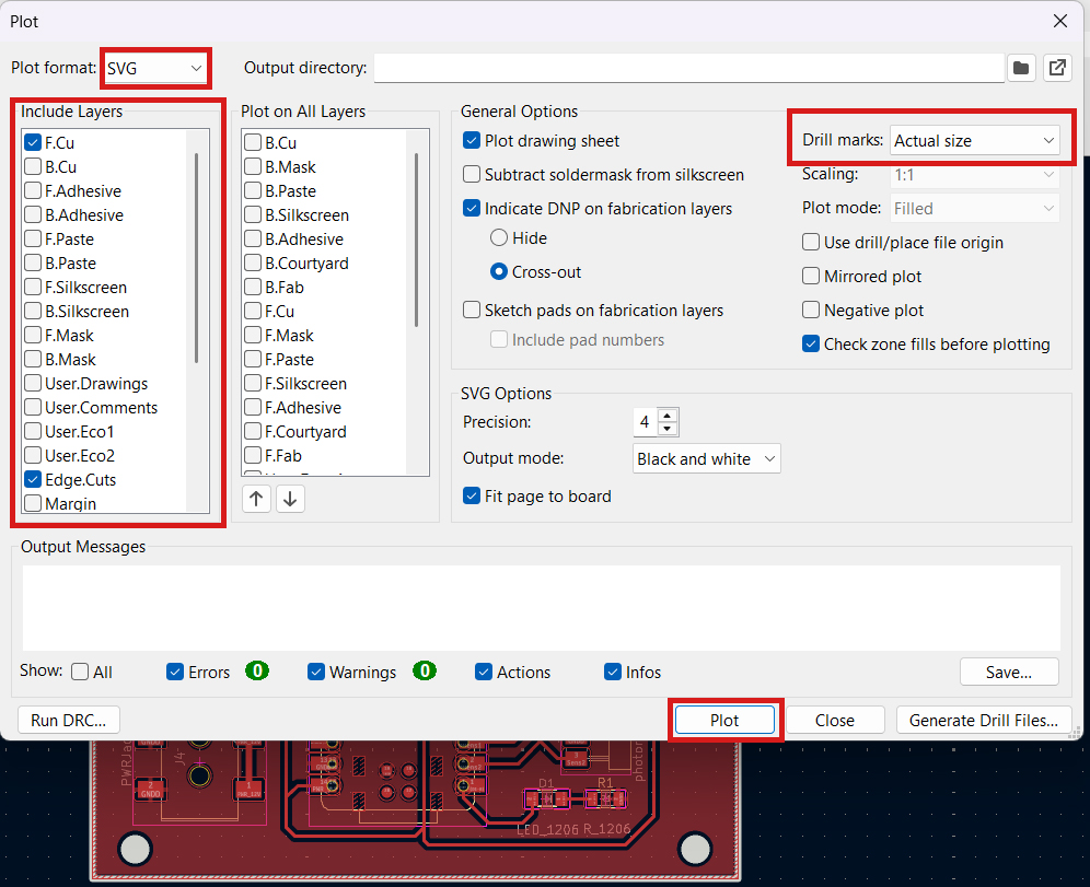 After preparing the file for export, I navigated to File → Fabrication Outputs → Gerbers (.gbr). In the opened window, I changed the plot format from Gerber to SVG to match the required output format for further processing.