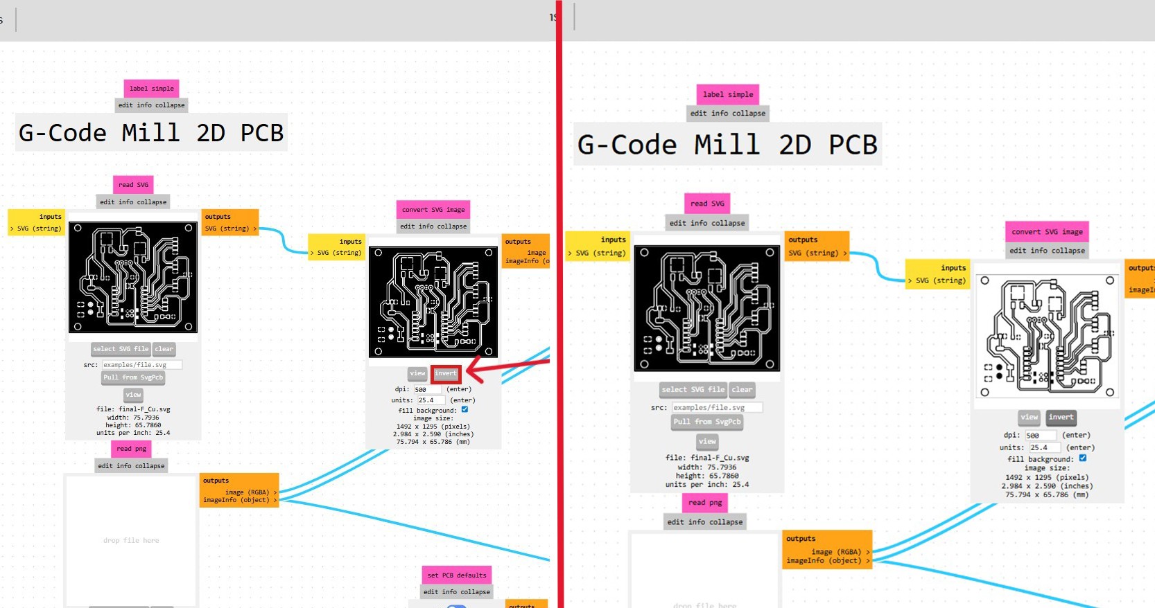 At this stage, I applied the invert operation, since in the milling process the black areas are interpreted as material to be removed. This ensures that the copper traces are preserved while the surrounding material is milled away.