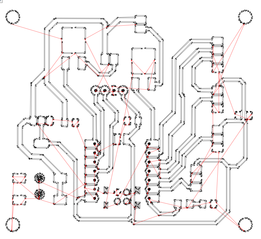 I reviewed the generated toolpath in the preview (3), where the milling paths on the PCB were clearly visible. The red lines represent the tool movements between different areas.