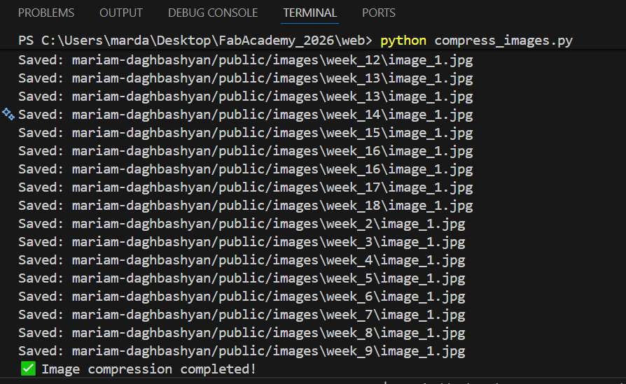 I initially asked GitHub Copilot (AI pair programmer) to generate a compression script and then modified the code to match my specific folder structure and workflow. The script processes images from a source directory and saves the compressed versions into the public/images directory of my project in an organized way.