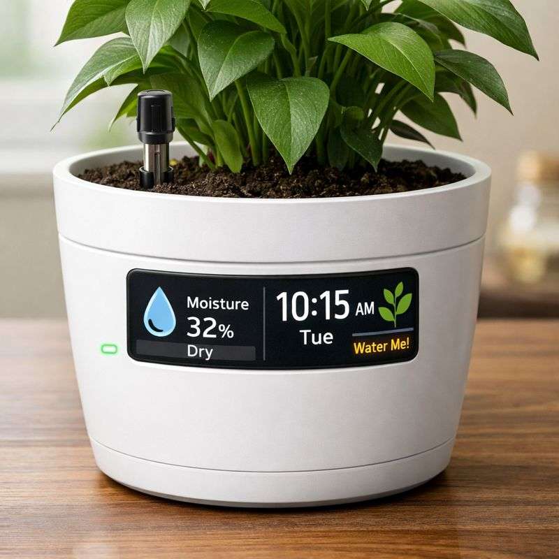 “Generate a concept image of a smart plant pot with sensors and a display showing moisture percentage, time, and watering notification.”
