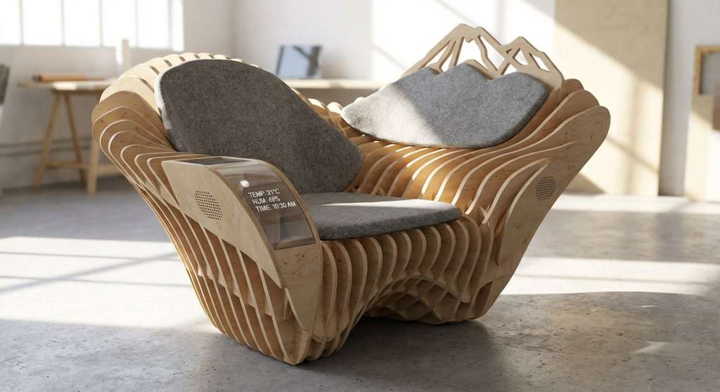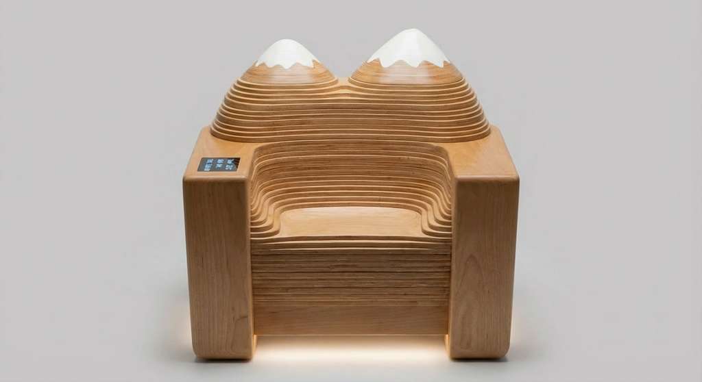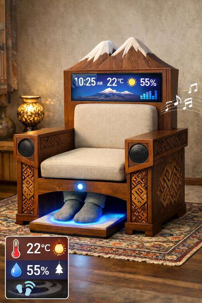 “Generate an image for smart chair which looks like mount Ararat, It will be have a display temperature, humidity, time, music, and sensor when a human is set his feel.”