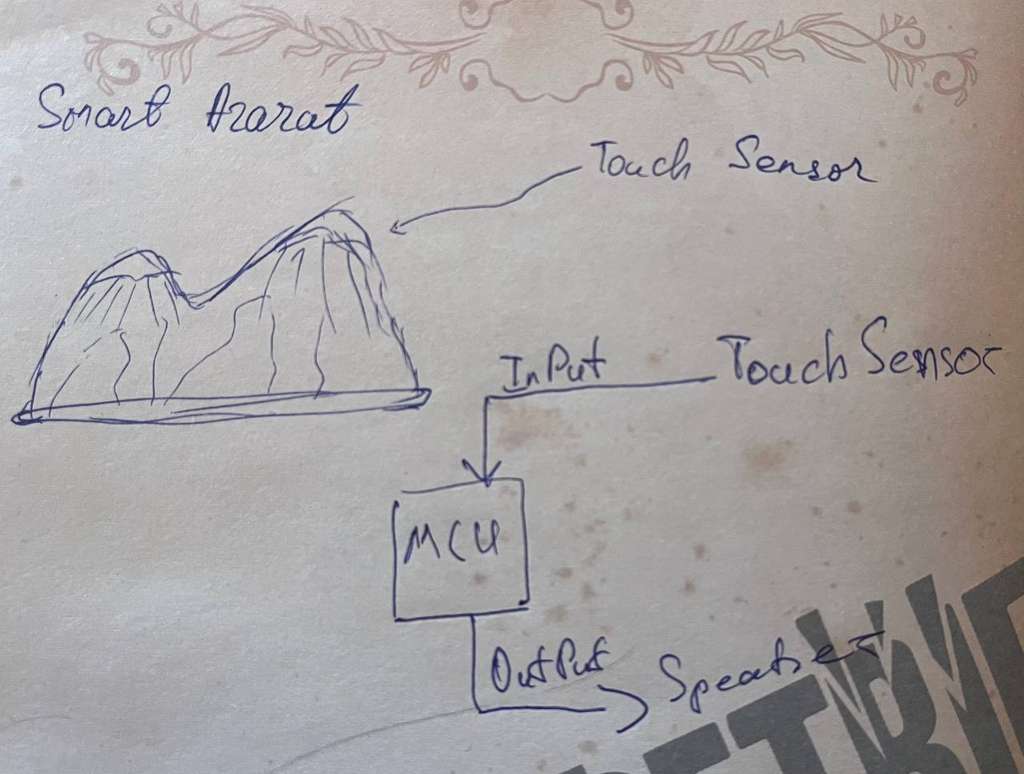 Considering the political situation in the region, a new idea came to my mind. I wanted to include a model inspired by Mount Ararat in my project. Initially, I planned to create a decorative Mount Ararat model with sensors: when touched, lights would turn on and Armenian music (such as Aram Khachaturian, Komitas, etc.) would start playing. Here is one example of the AI-generated concept image: