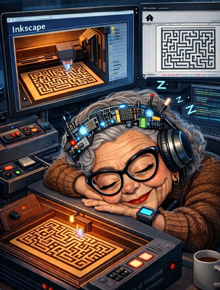 “This image is a painting of me, and I would like you to create a new image with a computer-aided design theme showing this grandmother using CAD tools.”