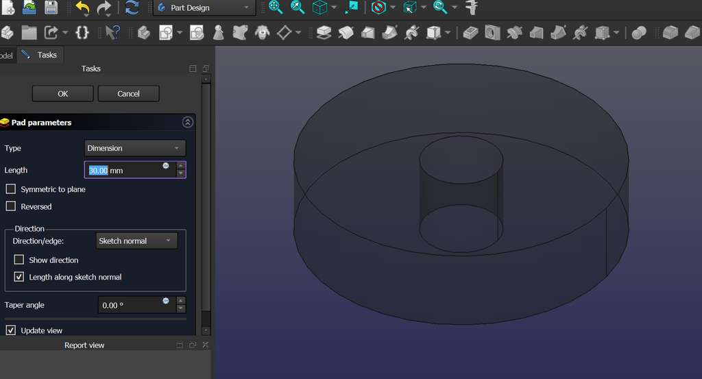 Next, I selected the Pad feature and created a new Sketch on top of it to add additional geometry. I drew another circle and applied a small extrusion depth—not a full one—mainly for visual enhancement.