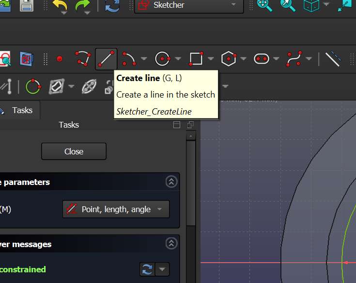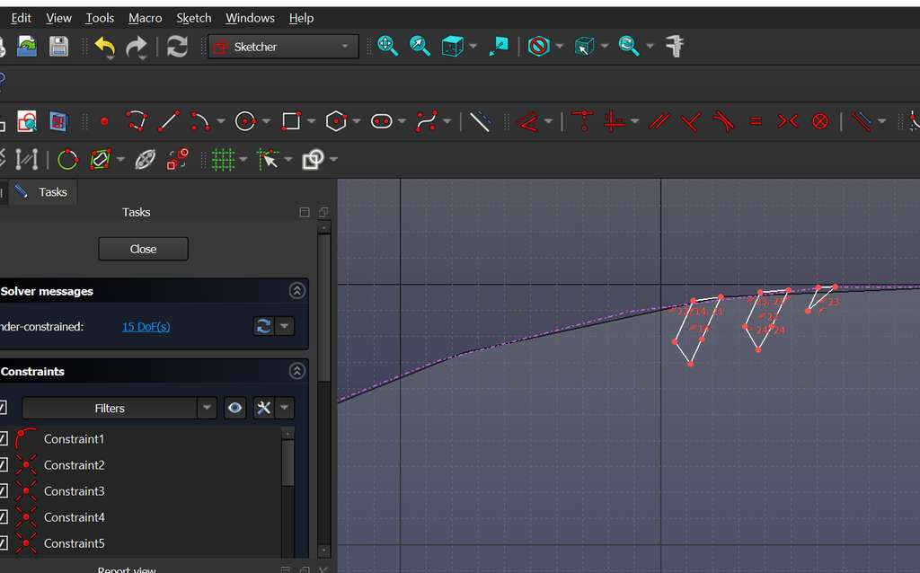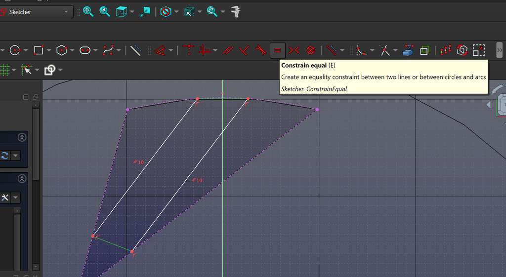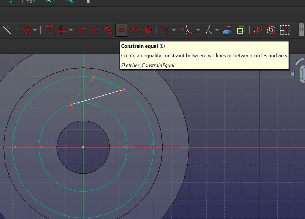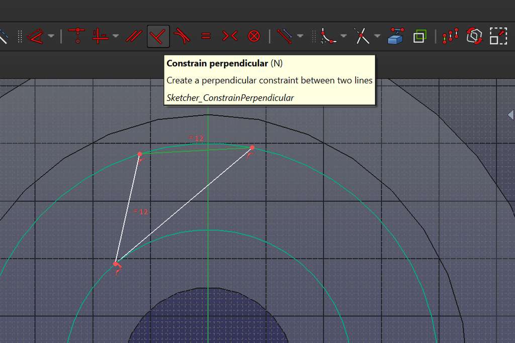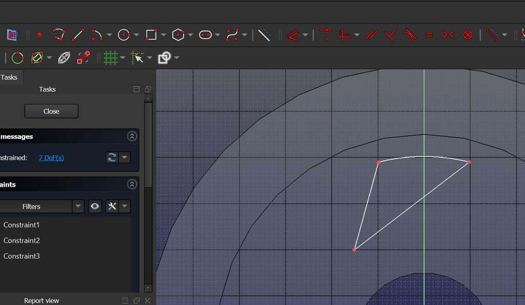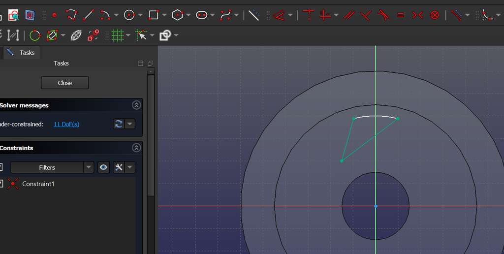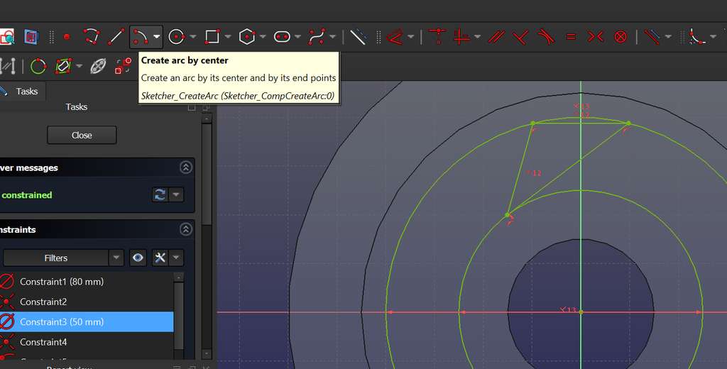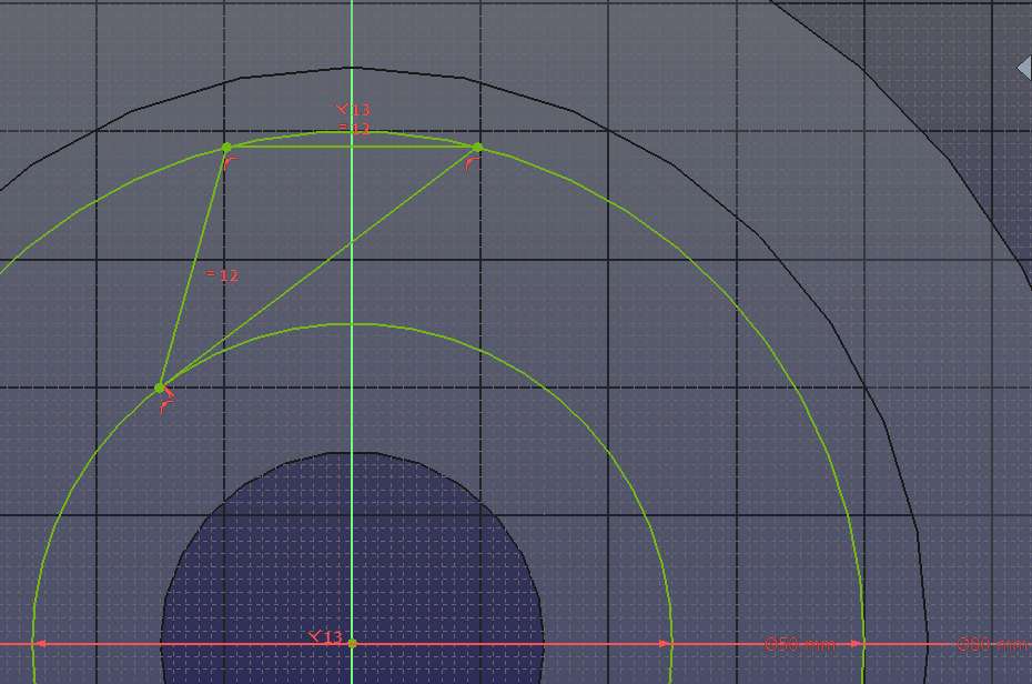 After the triangle turned green (fully constrained), I used the Create Arc by Center tool to draw an arc along the edge of the triangle. Then, I removed the unnecessary remaining segments.