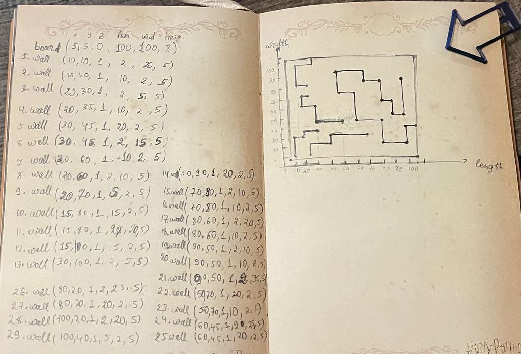 Here is the sketch I used to calculate the positions and orientations of the walls and to design the labyrinth.