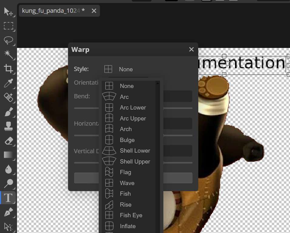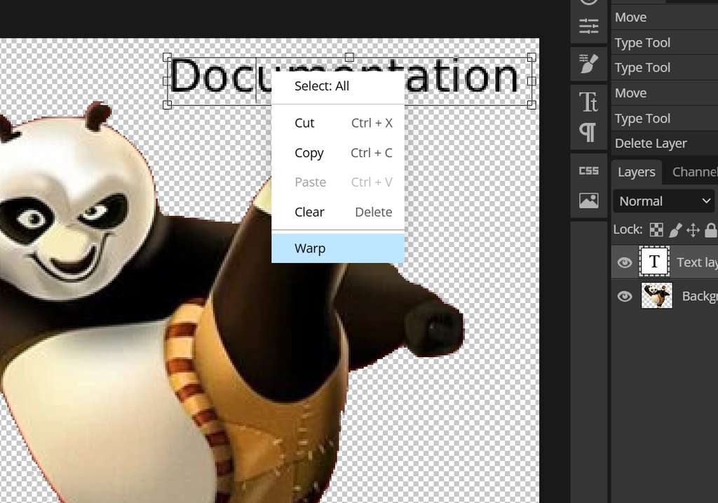 Next, I select the Type Tool(T) and click on the area where I want to place the text. After typing the text, I right-click on the text layer and choose Warp.