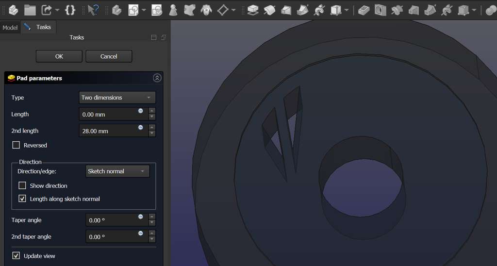 After closing the Sketch, I selected it and applied the Pad tool, setting the Type to Two Dimensions, which resulted in the following shape.