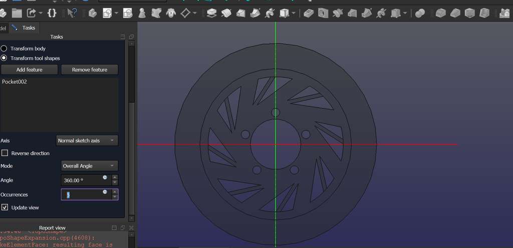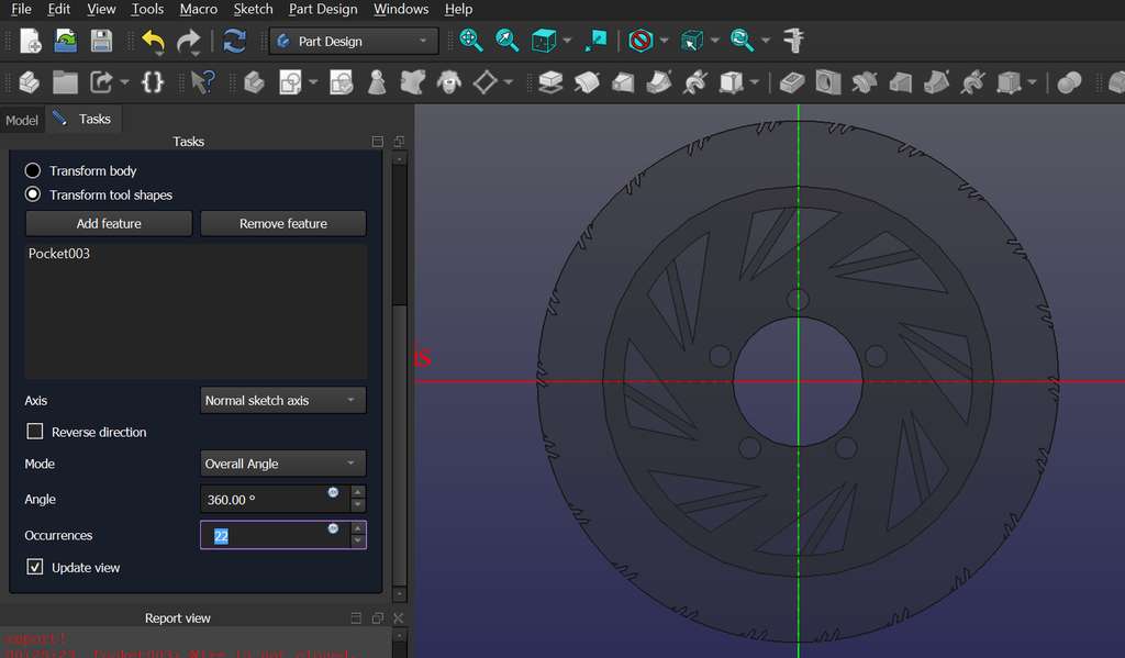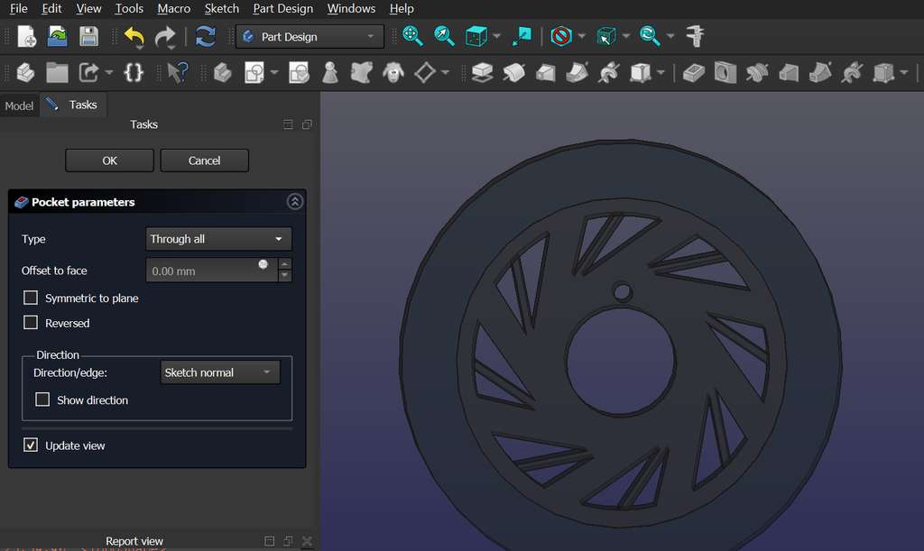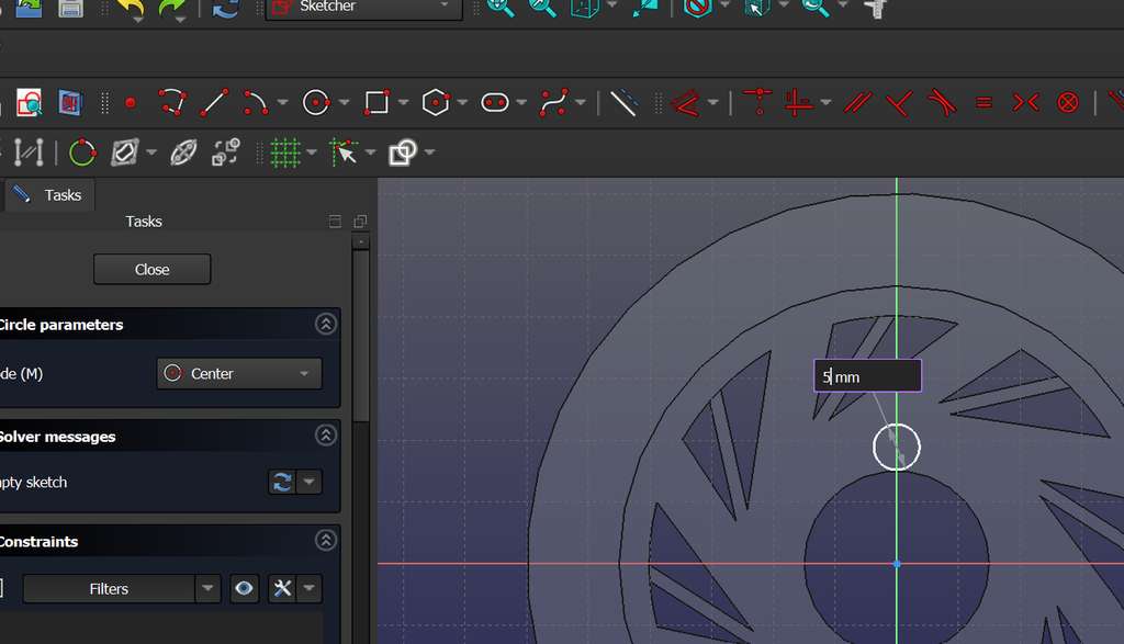 Then, I added another Sketch to create holes near the center. I drew a small circle with a defined diameter and created another Pocket. After closing it, I selected the created Pocket and used Polar Pattern, setting the number of Occurrences to 5.