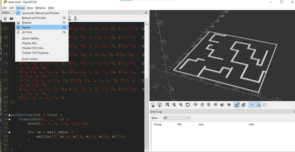 To design the labyrinth, I used the OpenSCAD Cheat Sheet as a reference guide. Here is a quick reference guide to the most essential commands and syntax for parametric 3D modeling.